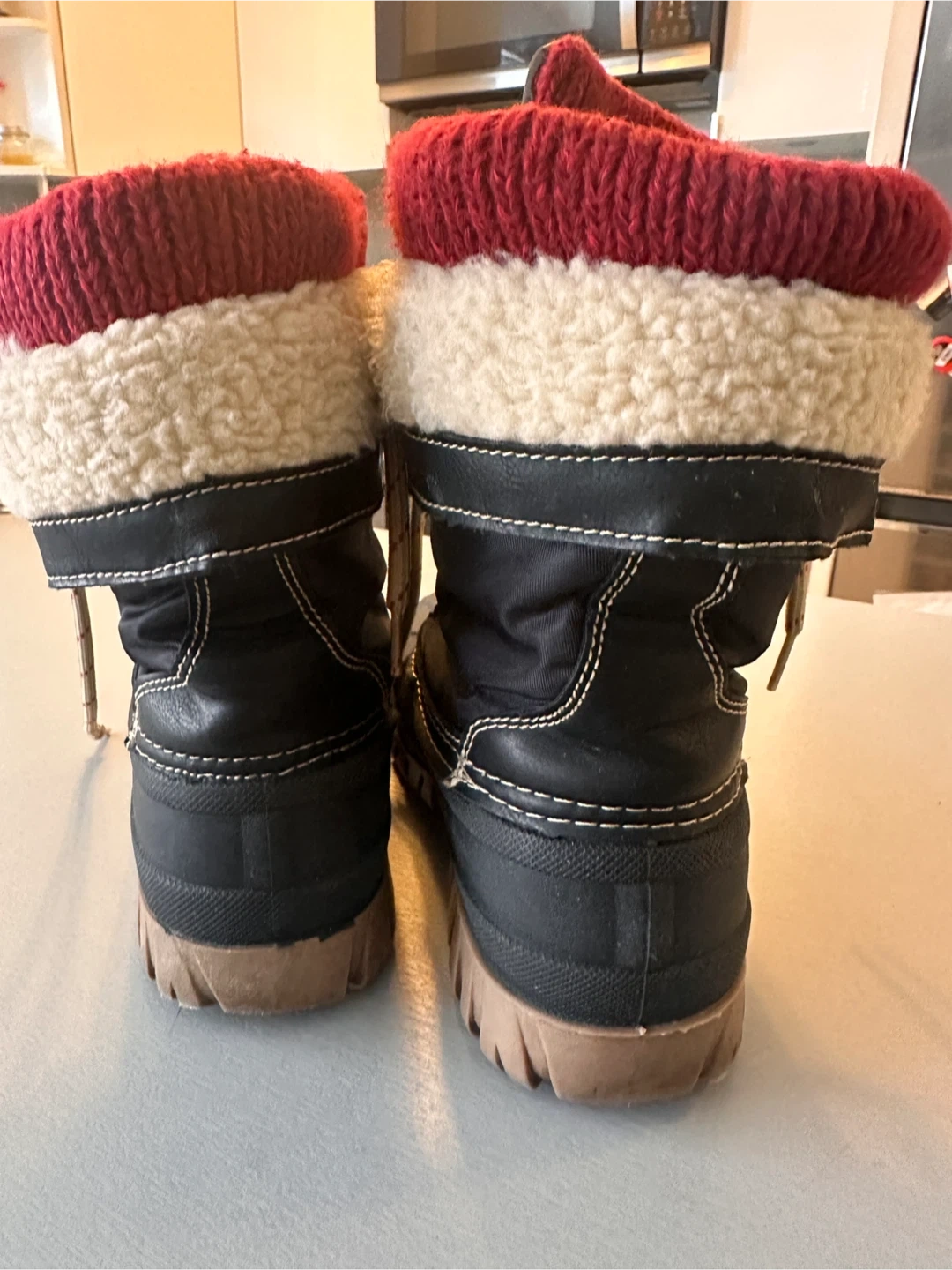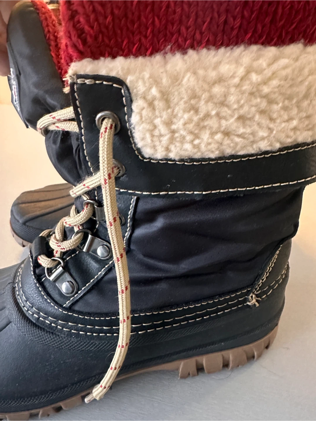 Cozy Cougar Storm winter boots, perfect for braving the Canadian weather. Black with red and cream knit cuffs. Lace-up style. Great for snow, ice and cold. Durable sole. These boots are in great condition.