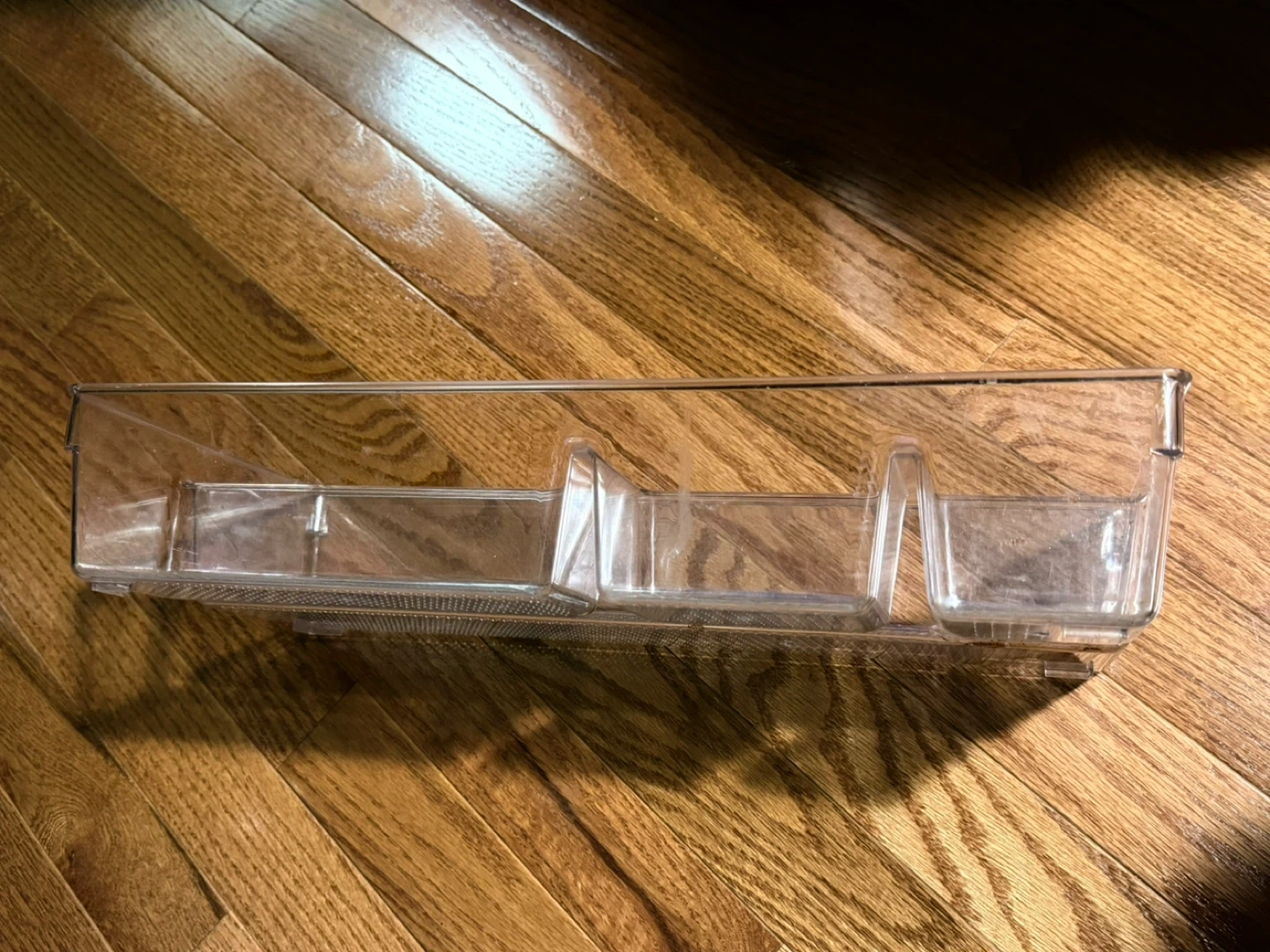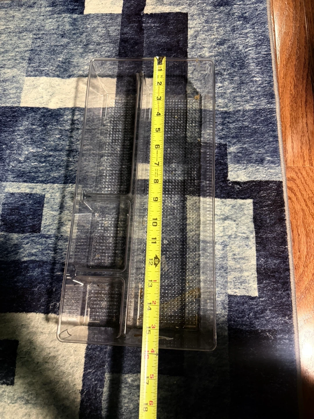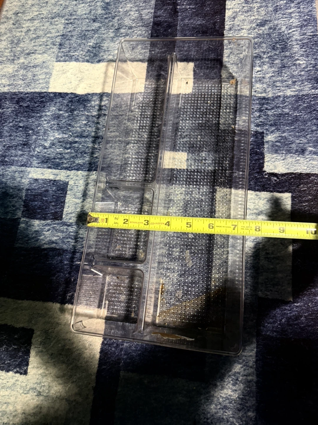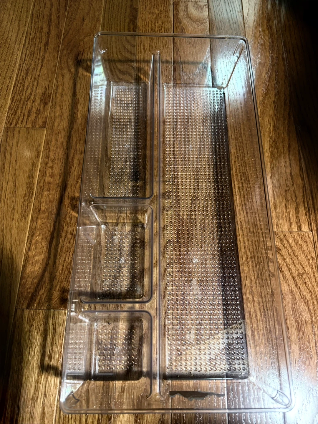This clear plastic organizer tray has multiple compartments for storing various items. It's approximately 16 inches long and 3 inches deep. The textured bottom helps keep items in place.