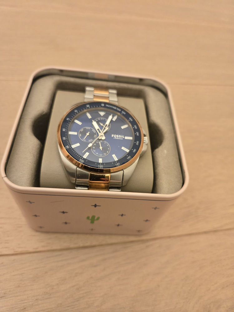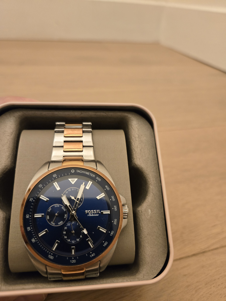 Selling a used Fossil Automatism men's watch! It's in great condition and comes with its original box. The watch features a stylish design with a blue face and a two-tone silver and gold band. Perfect for everyday wear or special occasions!