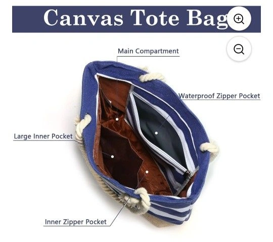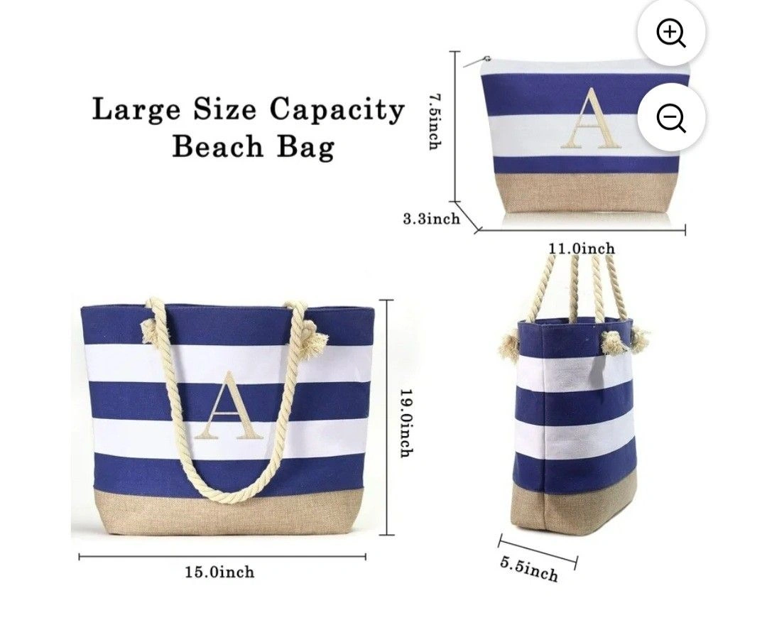 Brand new large capacity beach tote bag, comes with a cosmetic bag. The beach bag measures 19" x 5.5" x 15" inches, and the cosmetic bag measures 11" x 7.5" x 3.3" inches. Features include inner pockets, waterproof material, padded and adjustable straps, and inner dividers. Made of canvas.