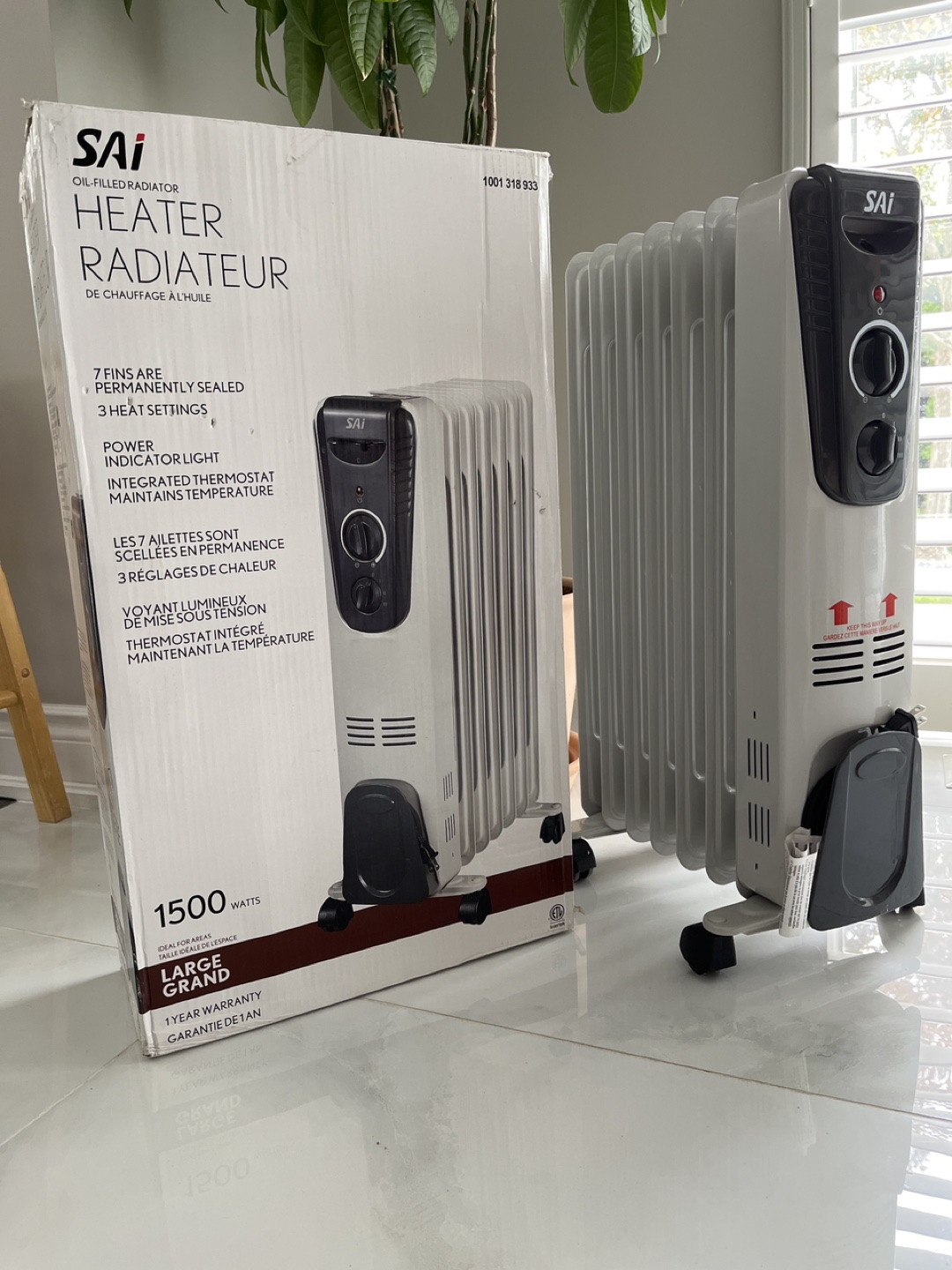 Oil-filled radiator heater. 7 fins, permanently sealed. 3 heat settings. Integrated thermostat. Power indicator light.