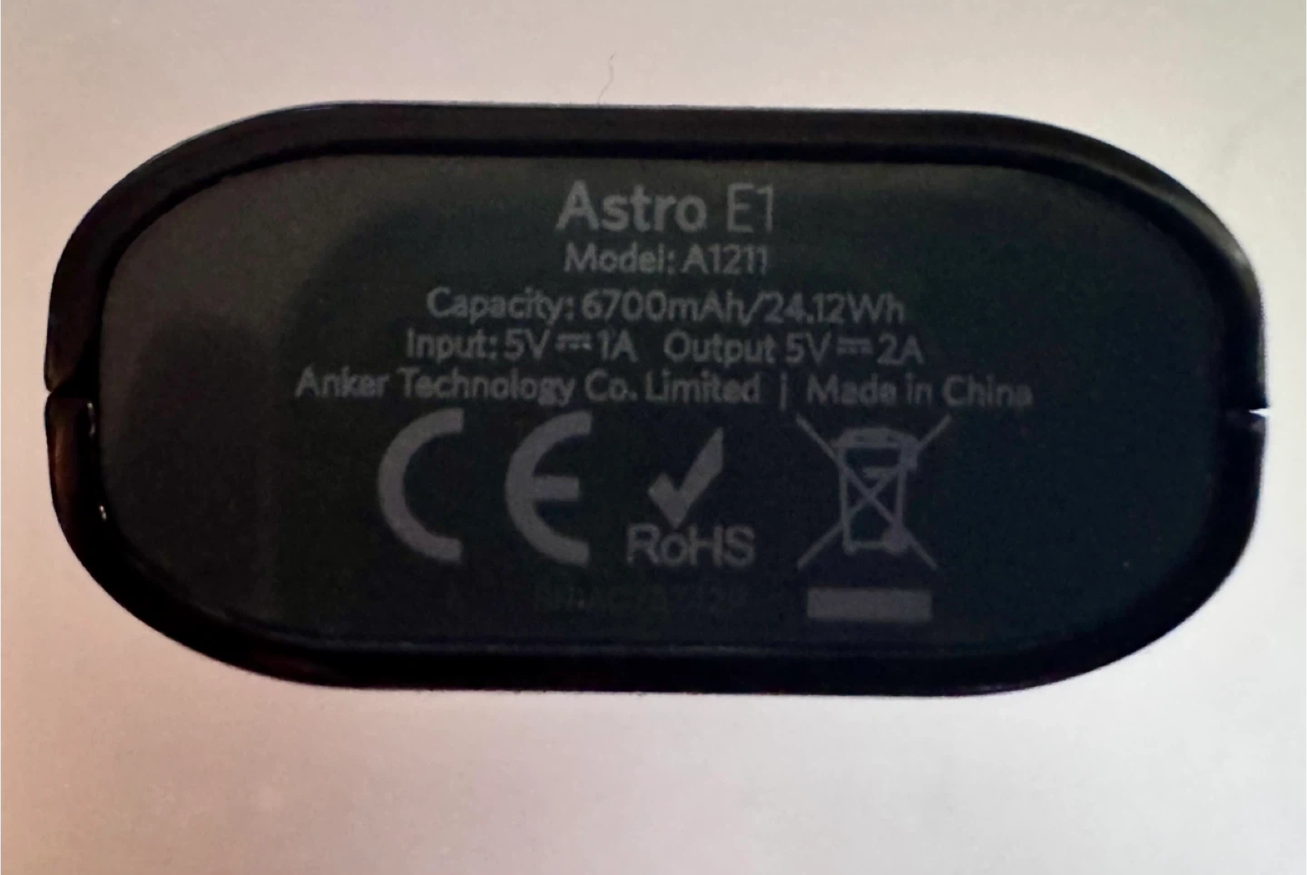 This is an Anker Astro E1, model A1211. It’s an extreme light and portable power bank. It has a capacity of 6700mAh. Includes a carrying pouch and a USB charging cable.