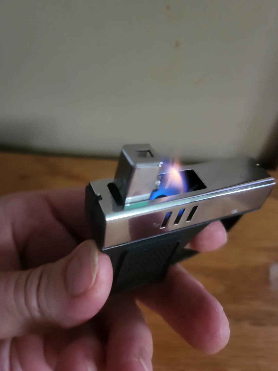 This is a unique novelty lighter shaped like a small handgun. It's made in Japan and features a metal casing with a black textured grip. The lighter is functional and produces a flame.