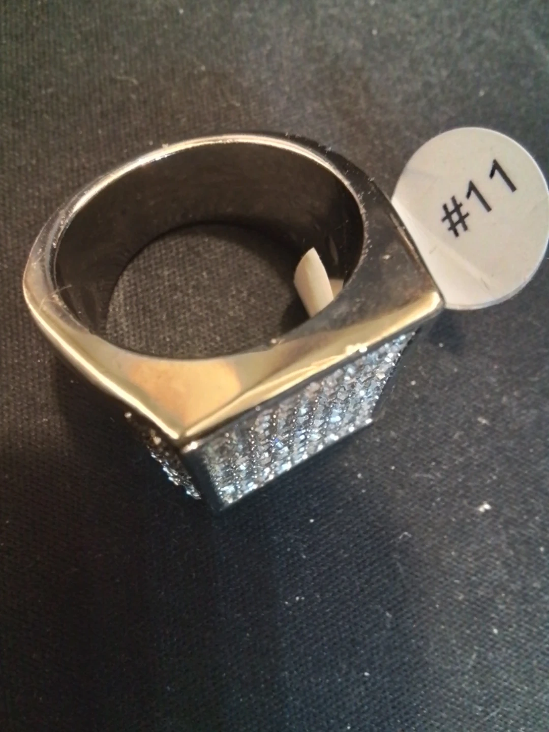 This Gents Silver Composite Bead Set Ring features a striking arrangement of white cubic zirconia (CZ) gemstones set in a size 11. This unique piece adds a touch of modern elegance to any look. This ring is new.