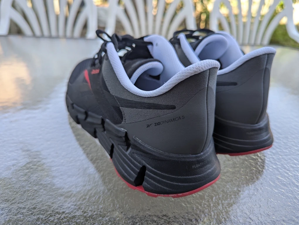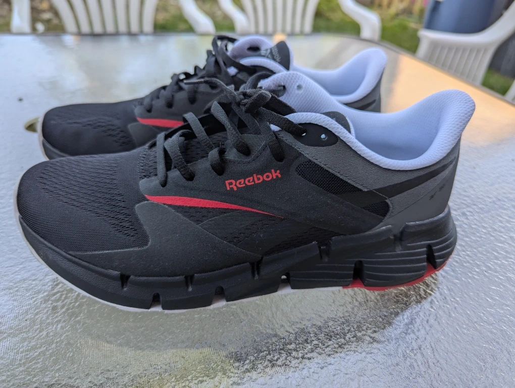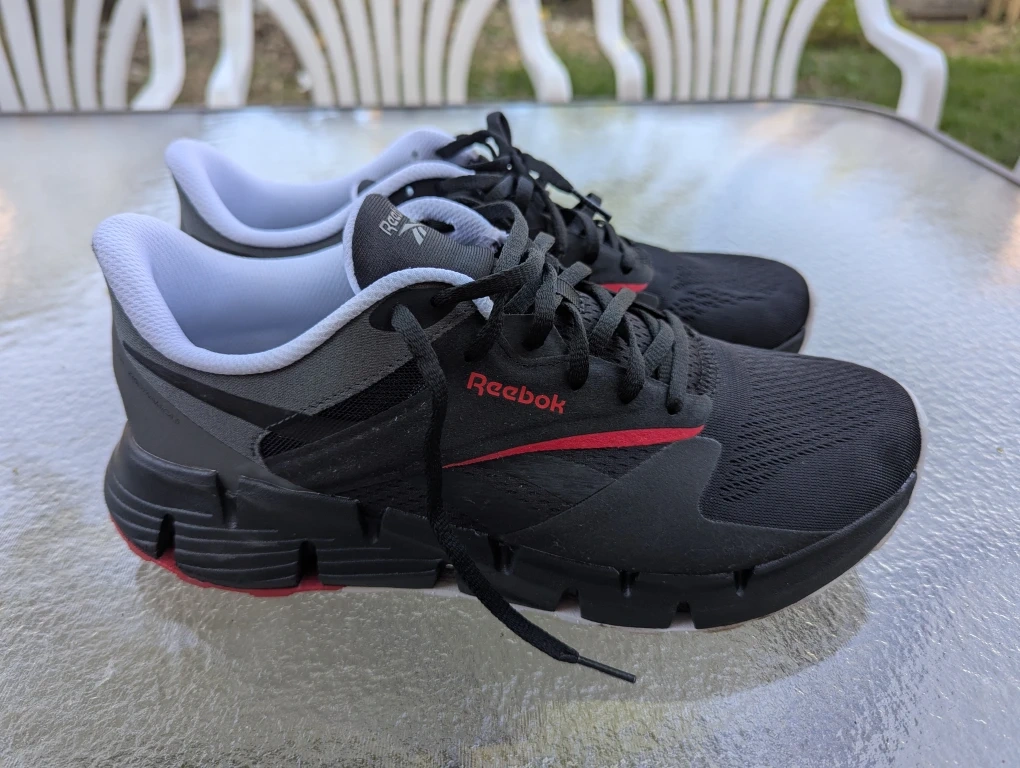 Size 11 Reebok Zig Dynamica 4 running shoes in black with red accents. These shoes feature Floatride Fuel cushioning for a responsive ride. They're lightweight and built for everyday comfort.