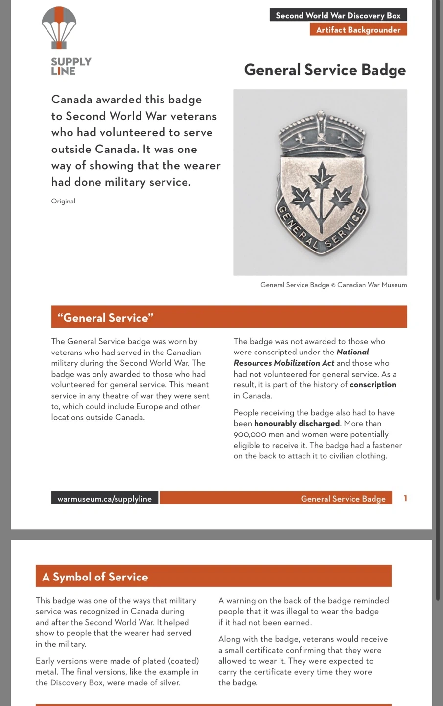 This is a General Service Badge awarded to Canadian veterans of World War II who volunteered to serve outside Canada. It's made of metal with a shield design featuring maple leaves and a crown. The back has "853228" and "STERLING DM CO" stamped on it, along with text about misuse. It comes with its original button attachment.