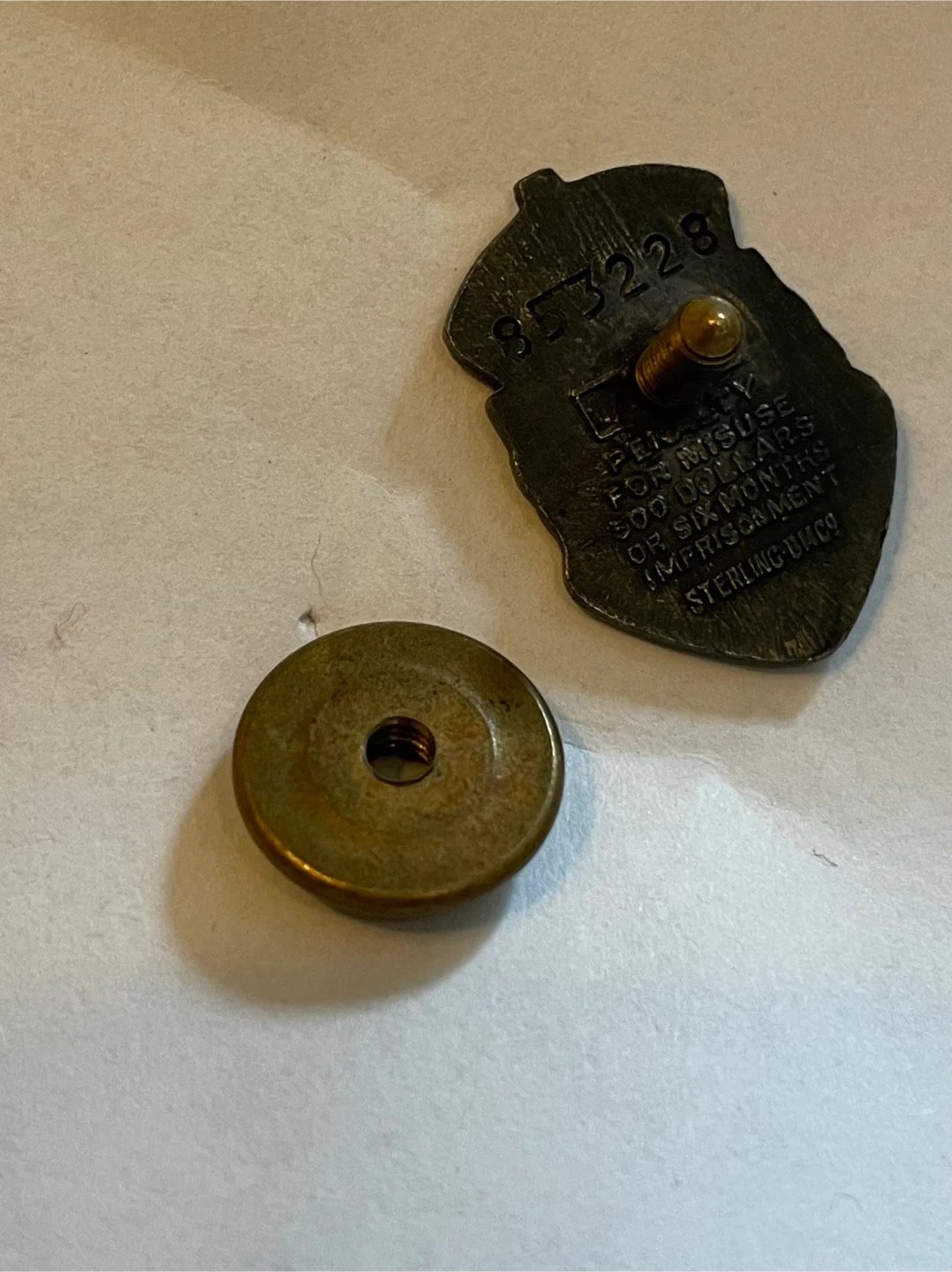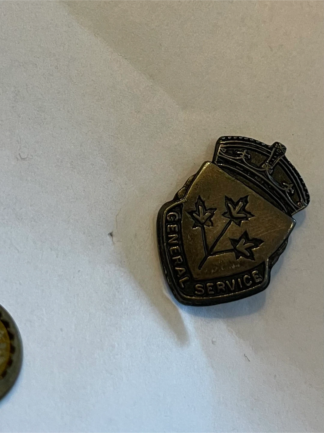 This is a General Service Badge awarded to Canadian veterans of World War II who volunteered to serve outside Canada. It's made of metal with a shield design featuring maple leaves and a crown. The back has "853228" and "STERLING DM CO" stamped on it, along with text about misuse. It comes with its original button attachment.