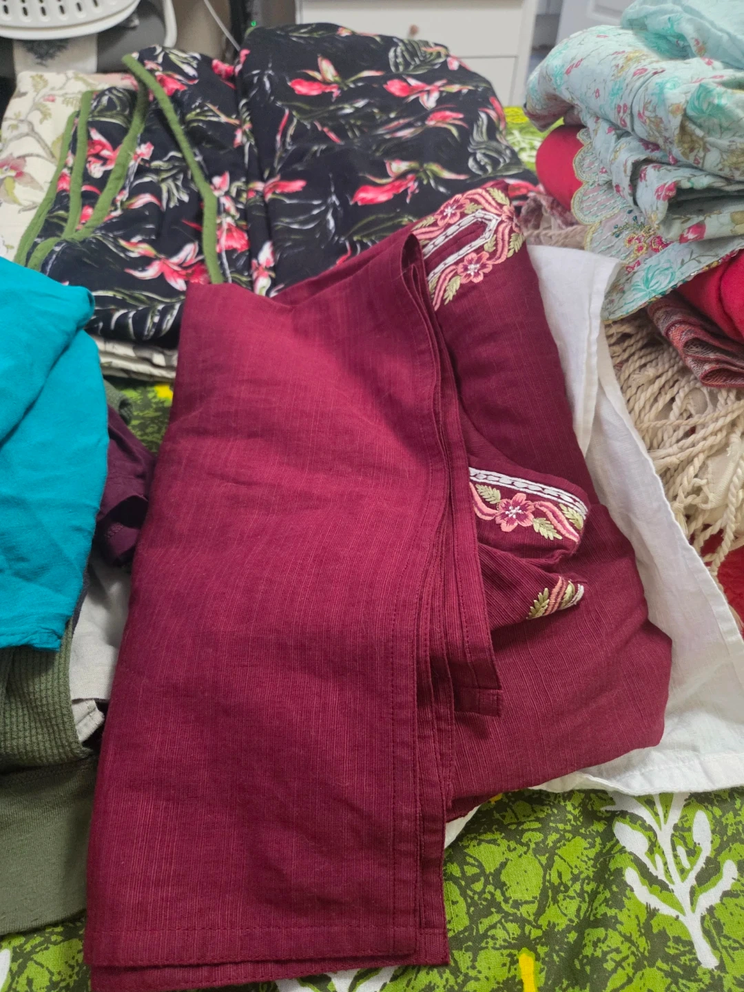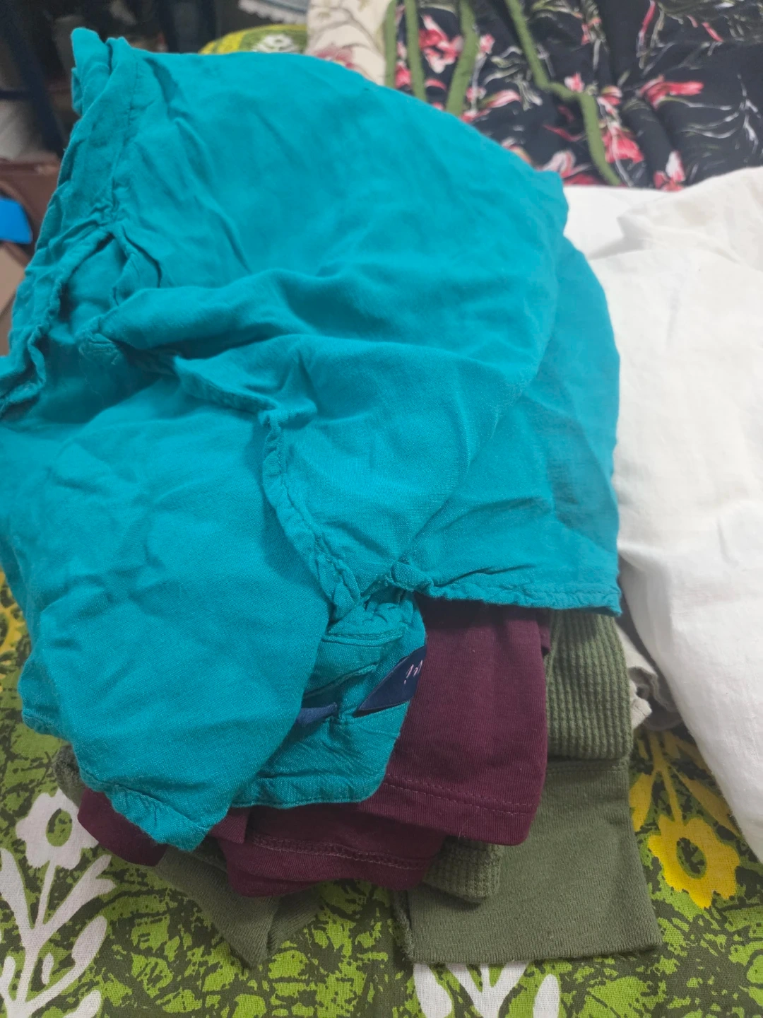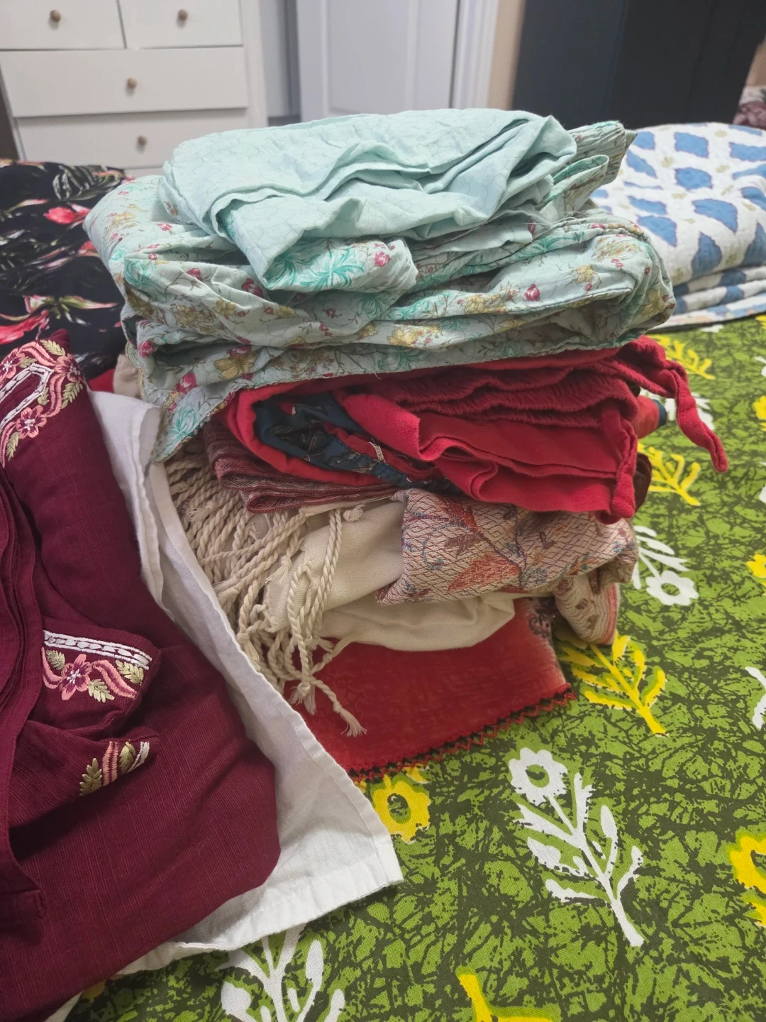 Hi. These are some clothes for woman size L. They are 3 piece Indian suits, kutis and some tshirts.