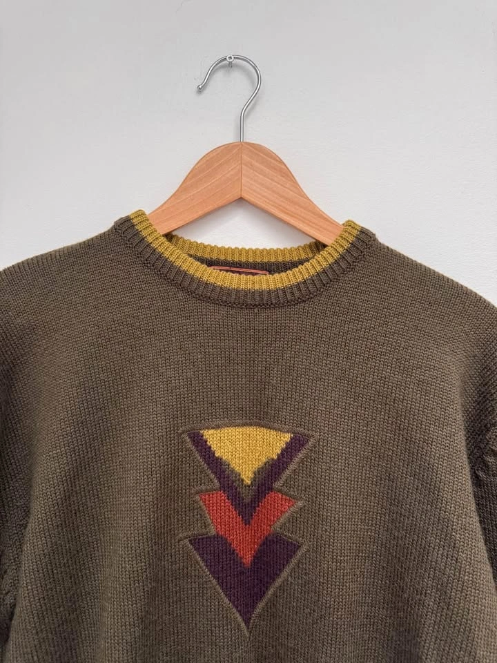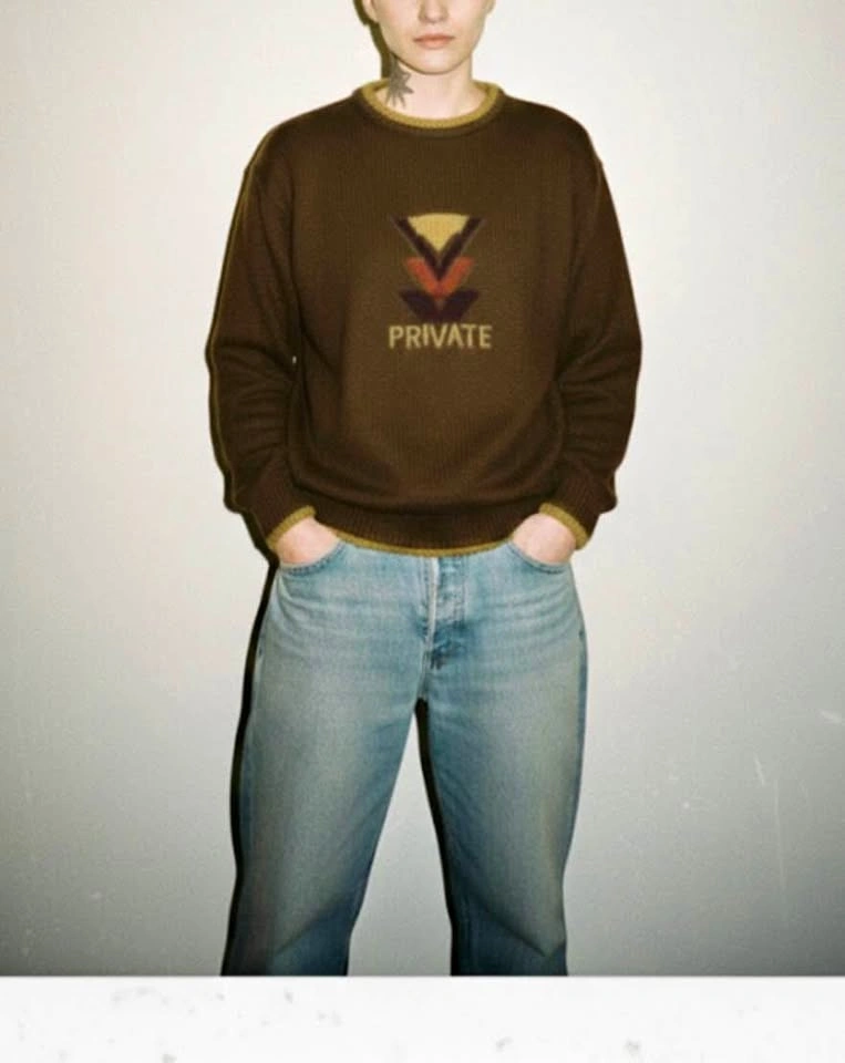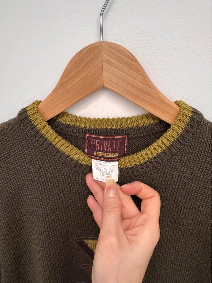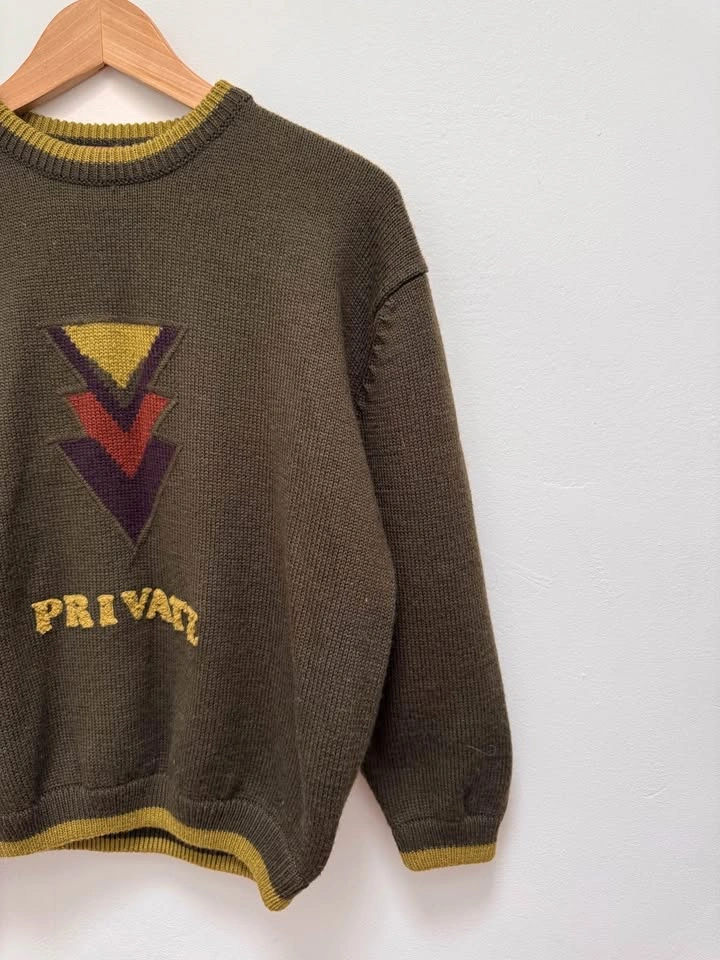 Unique vintage knit pullover sweater in a dark olive/brown with a striking gold, maroon, and black "V" graphic and "PRIVATE" text.