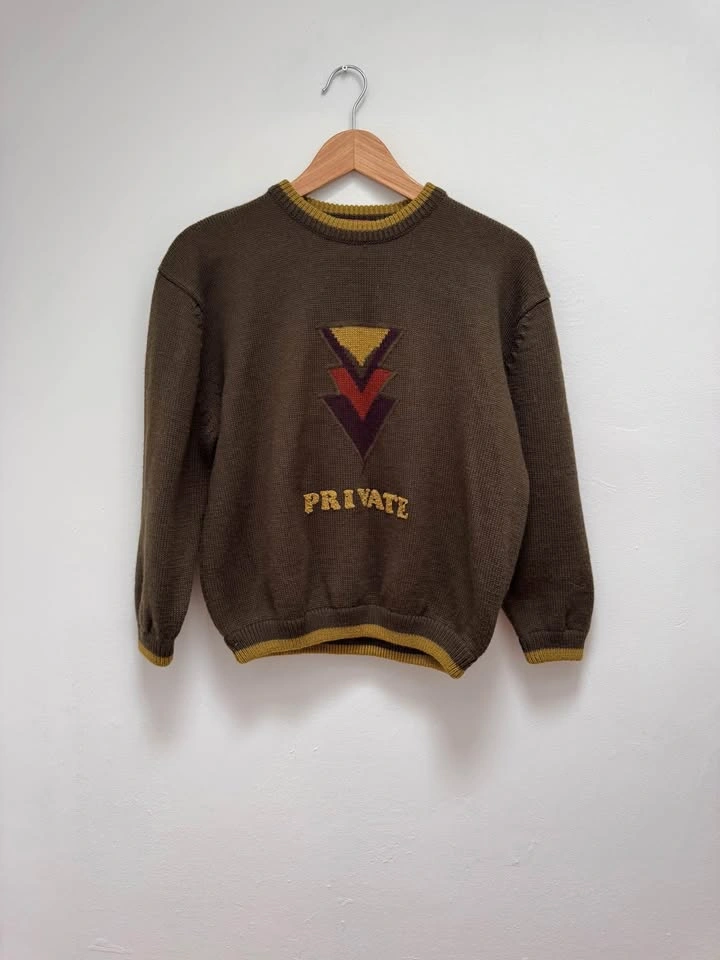 Unique vintage knit pullover sweater in a dark olive/brown with a striking gold, maroon, and black "V" graphic and "PRIVATE" text.