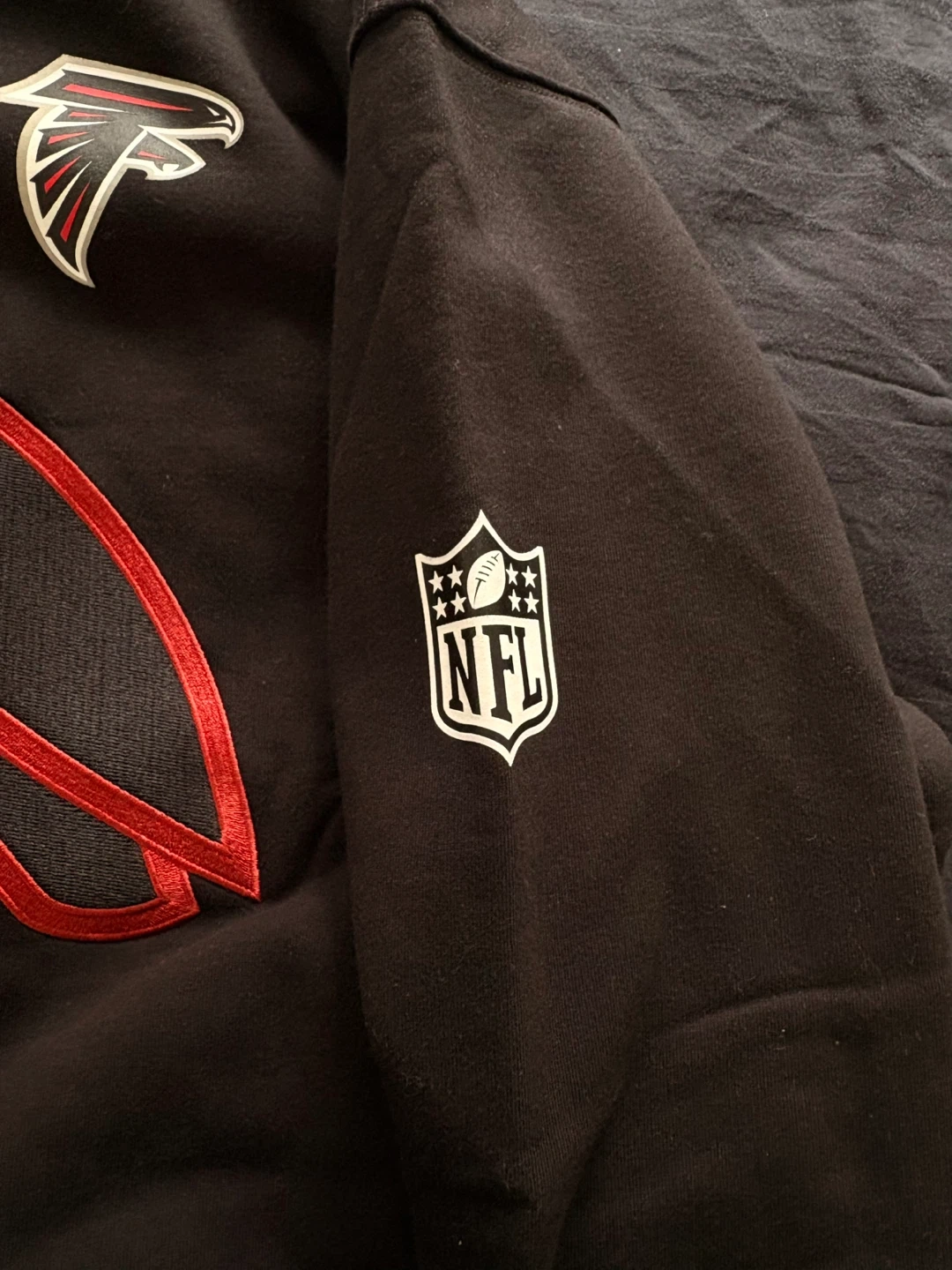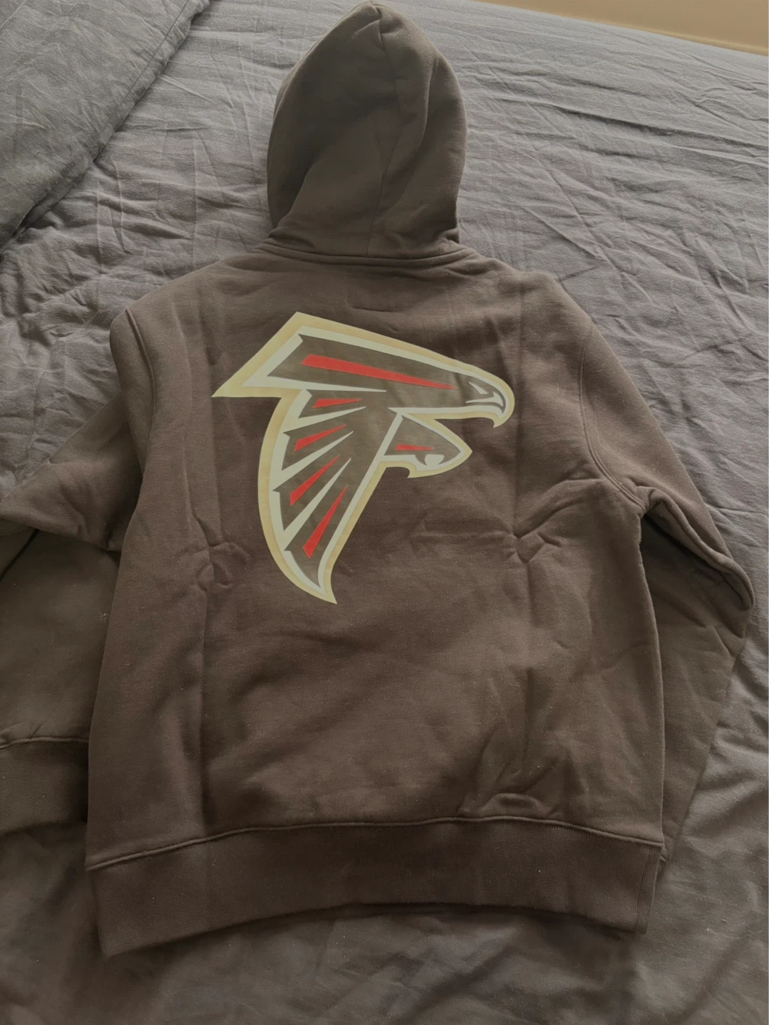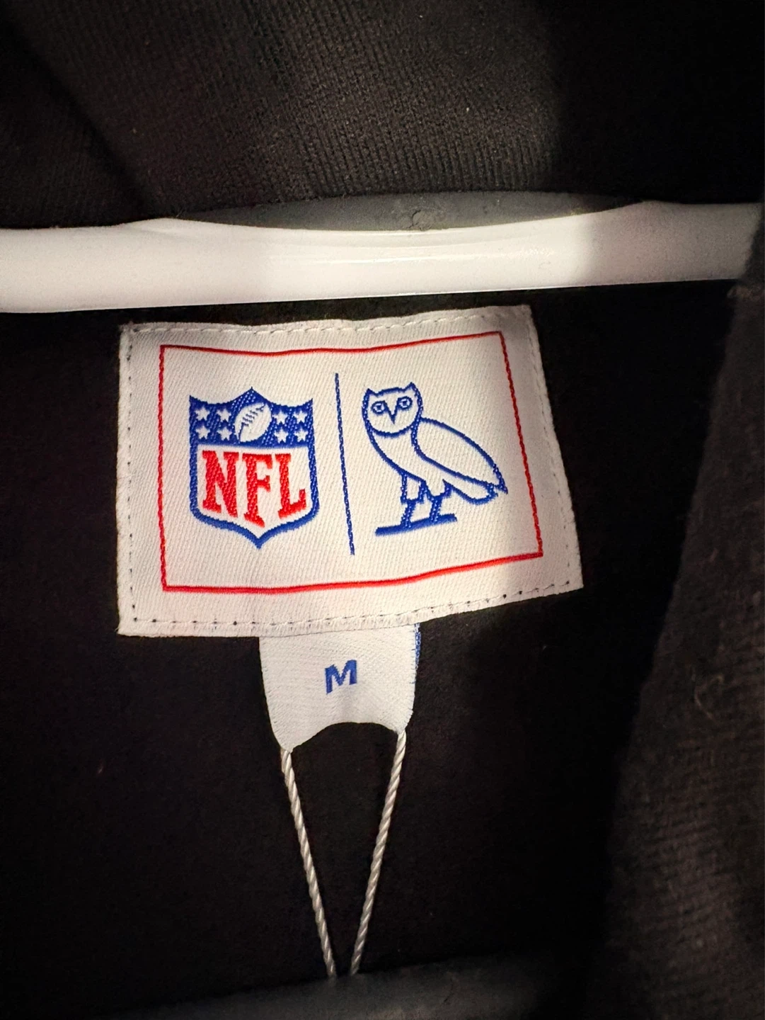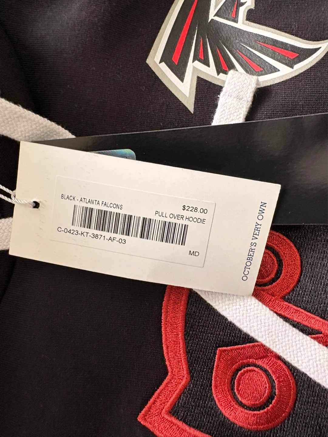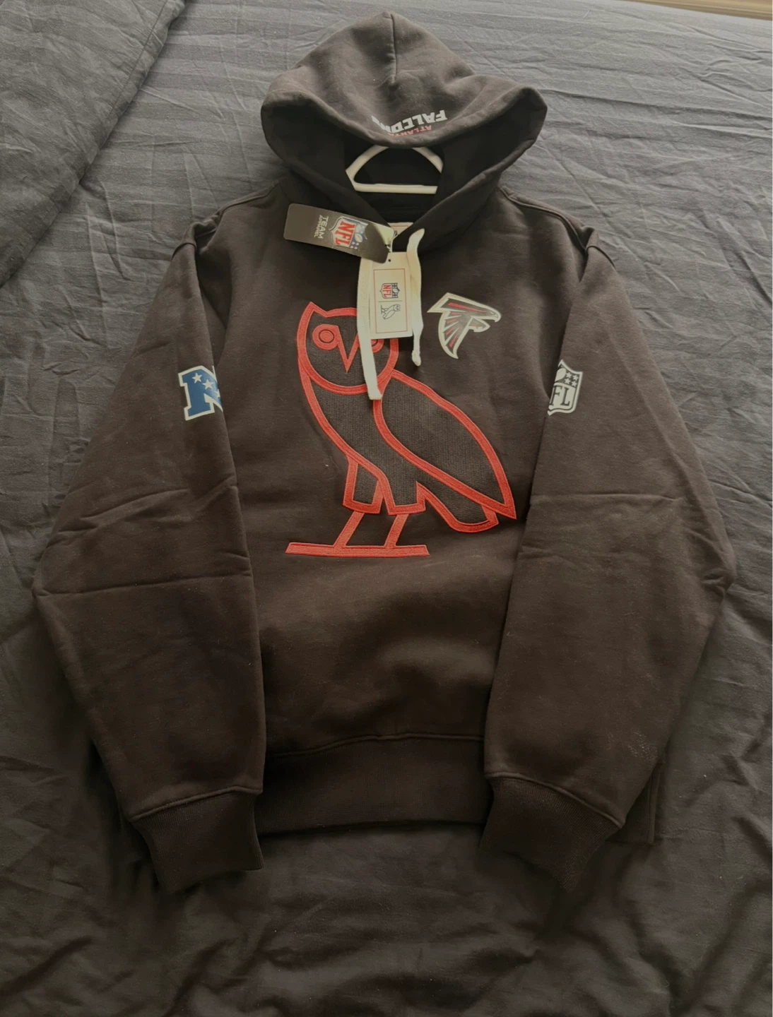 This is an OVO x NFL collaboration pull-over hoodie featuring the Atlanta Falcons logo. It's a size medium and made from a comfortable fabric. This hoodie is perfect for any NFL fan!