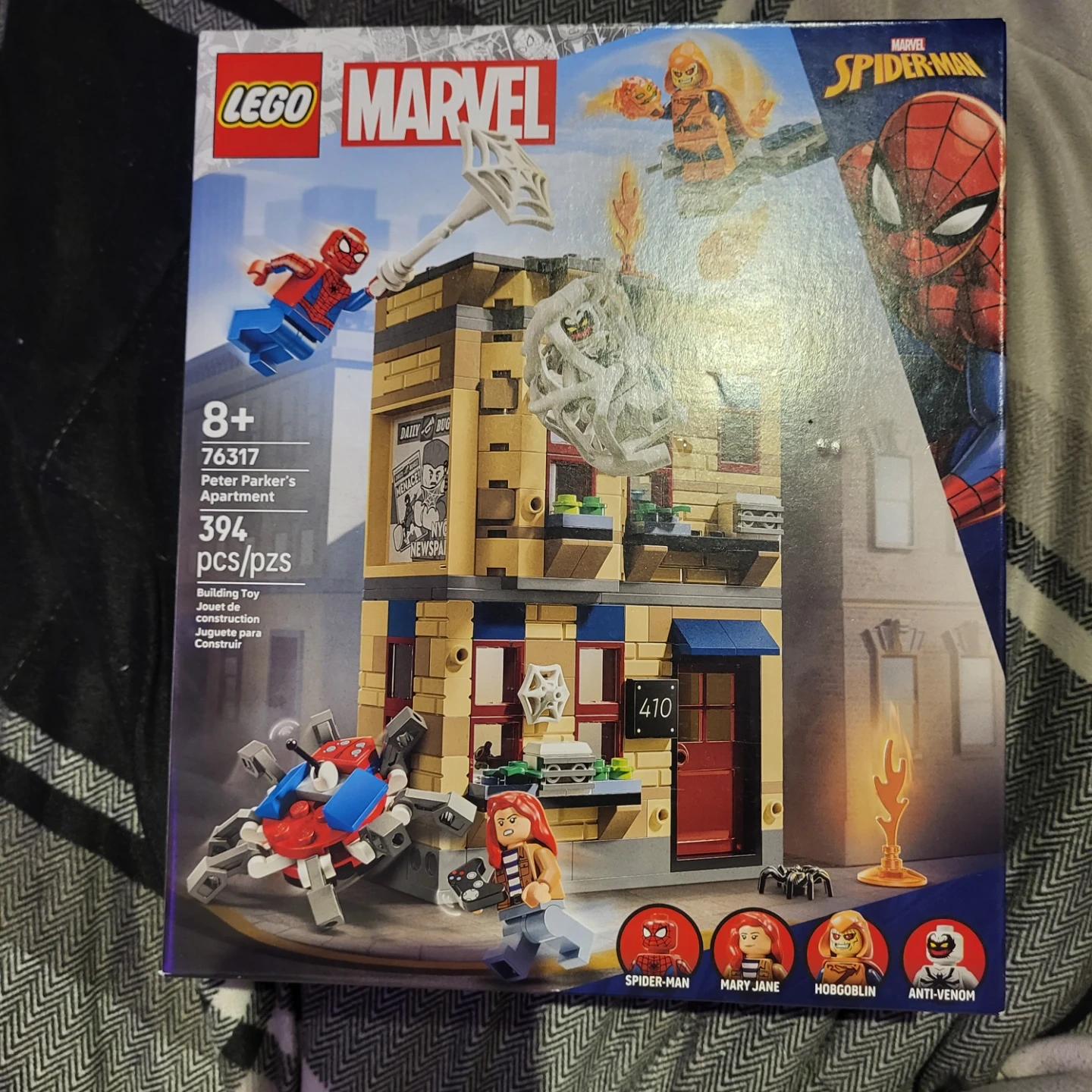 This LEGO Marvel set features Peter Parker's Apartment from Spider-Man. It includes 394 pieces and is recommended for ages 8 and up. The set comes with minifigures of Spider-Man, Mary Jane, Hobgoblin, and Anti-Venom.