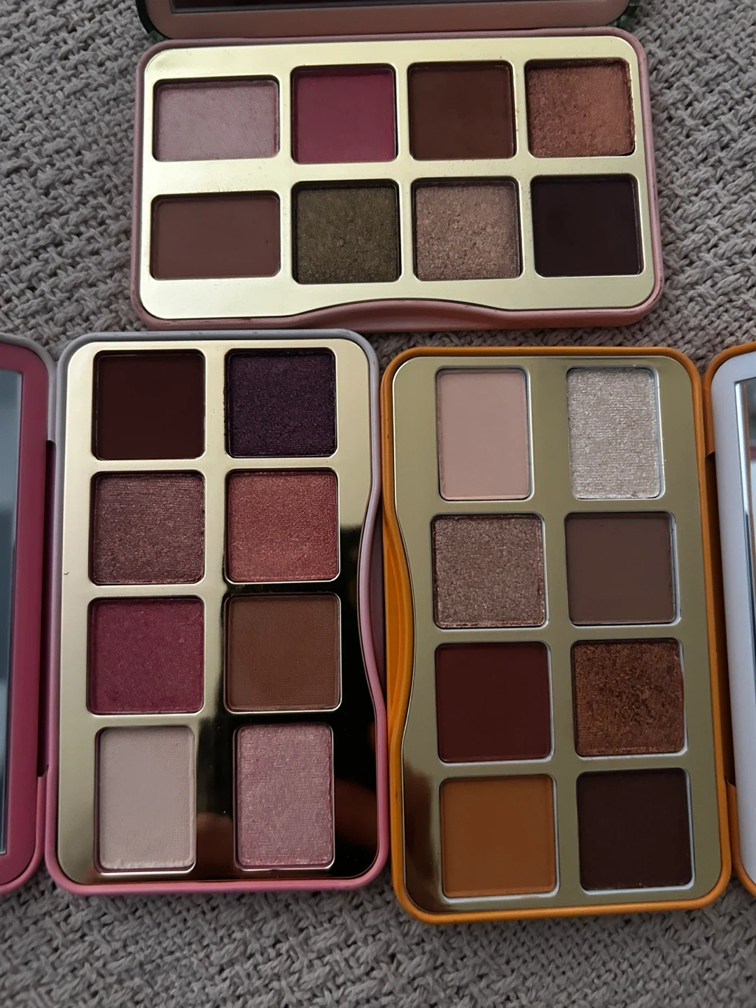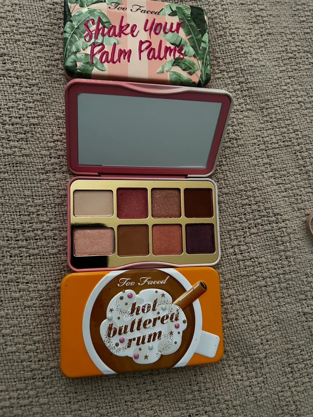 Selling a bundle of three Too Faced eyeshadow palettes: Shake Your Palm Palms, Tickled Peach, and Limited Edition Hot Buttered Rum. Each palette contains 6 eyeshadows and a mirror.