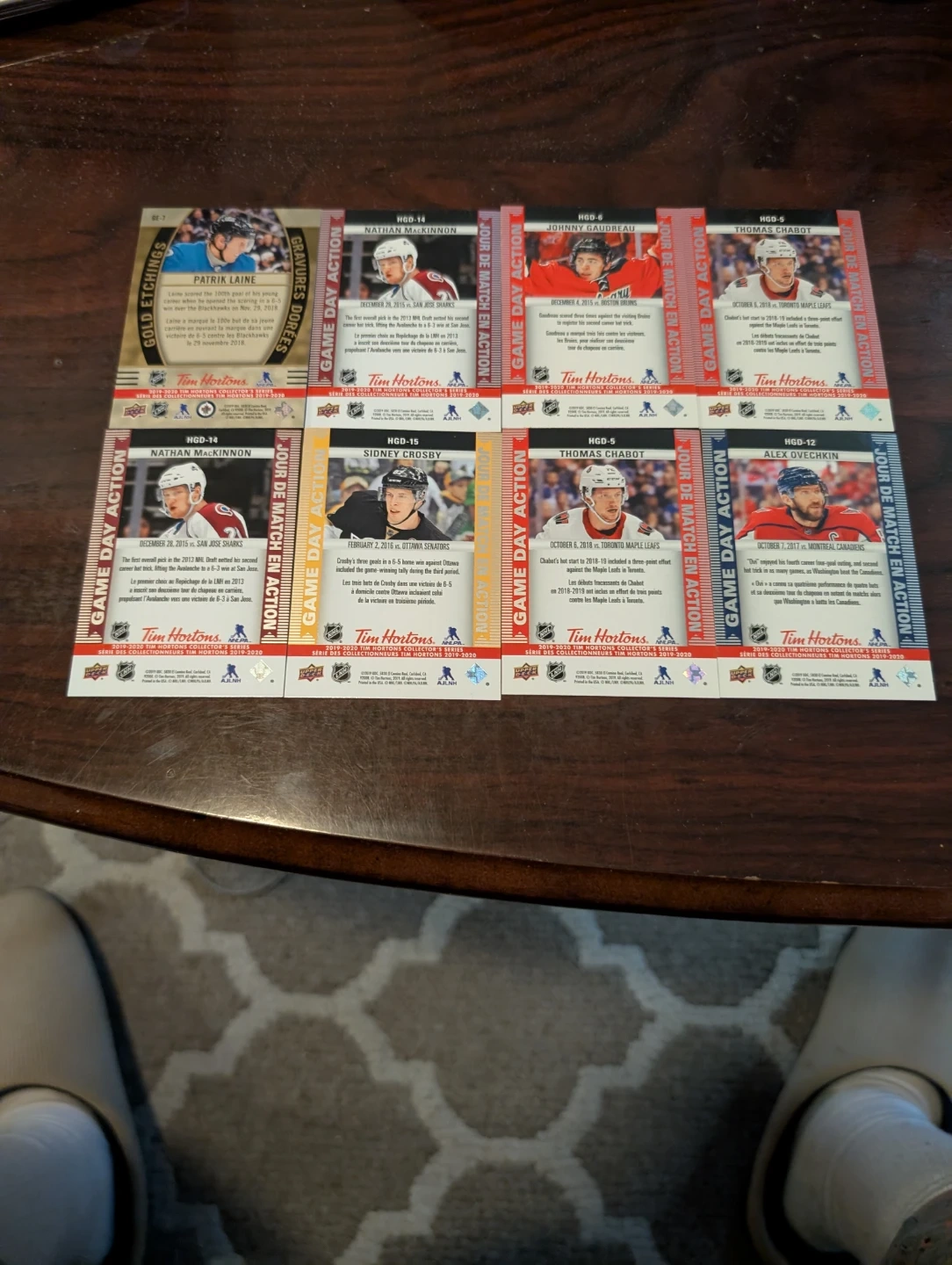 Selling a set of Tim Hortons hockey cards. Featuring players like Patrick Laine, Nathan MacKinnon, Johnny Gaudreau, Thomas Chabot, Sidney Crosby, and Alex Ovechkin. Great for any hockey fan or collector!