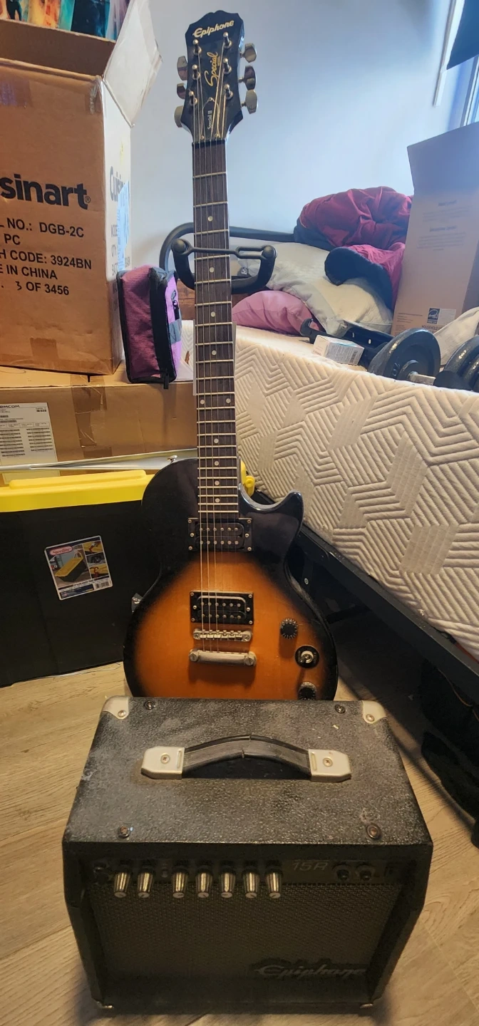 Epiphone electric guitar with a sunburst finish and black accents. It comes with a small amplifier and a black gig bag. And a stand. This electric guitar set is great for learning to play!