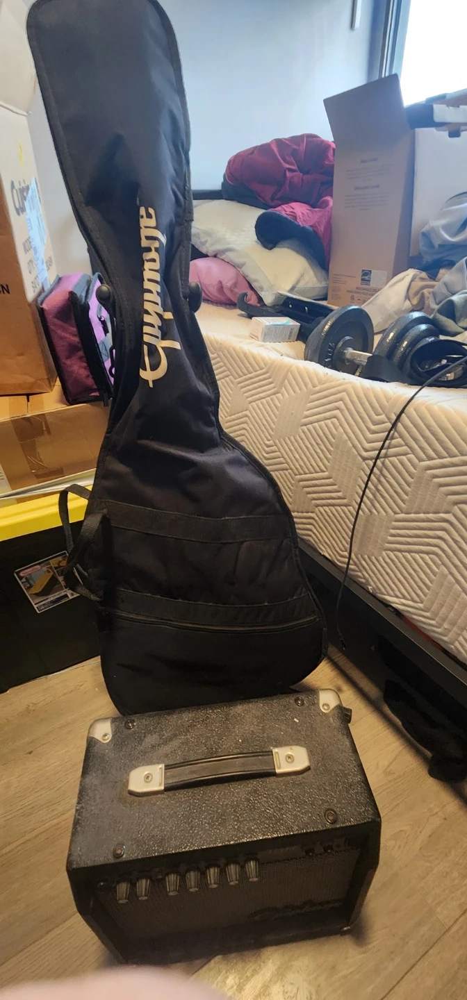 Epiphone electric guitar with amplifier, gig bag, guitar stand.