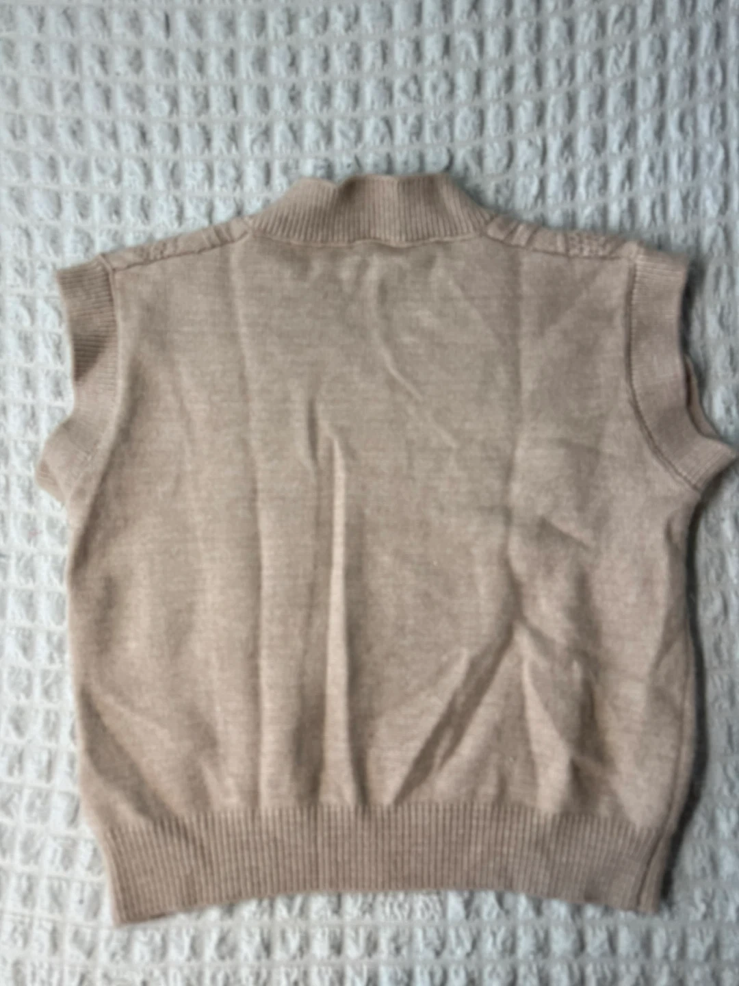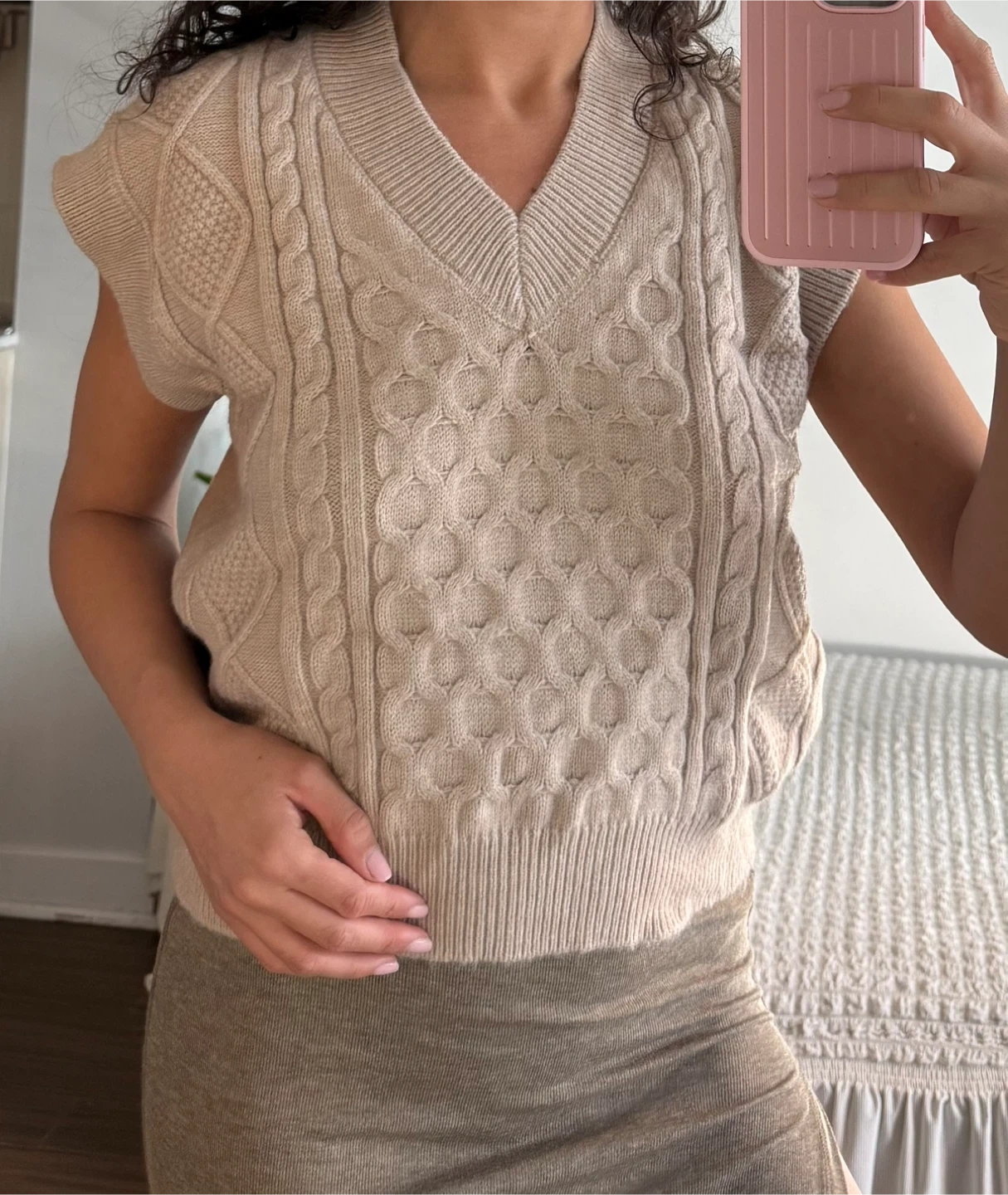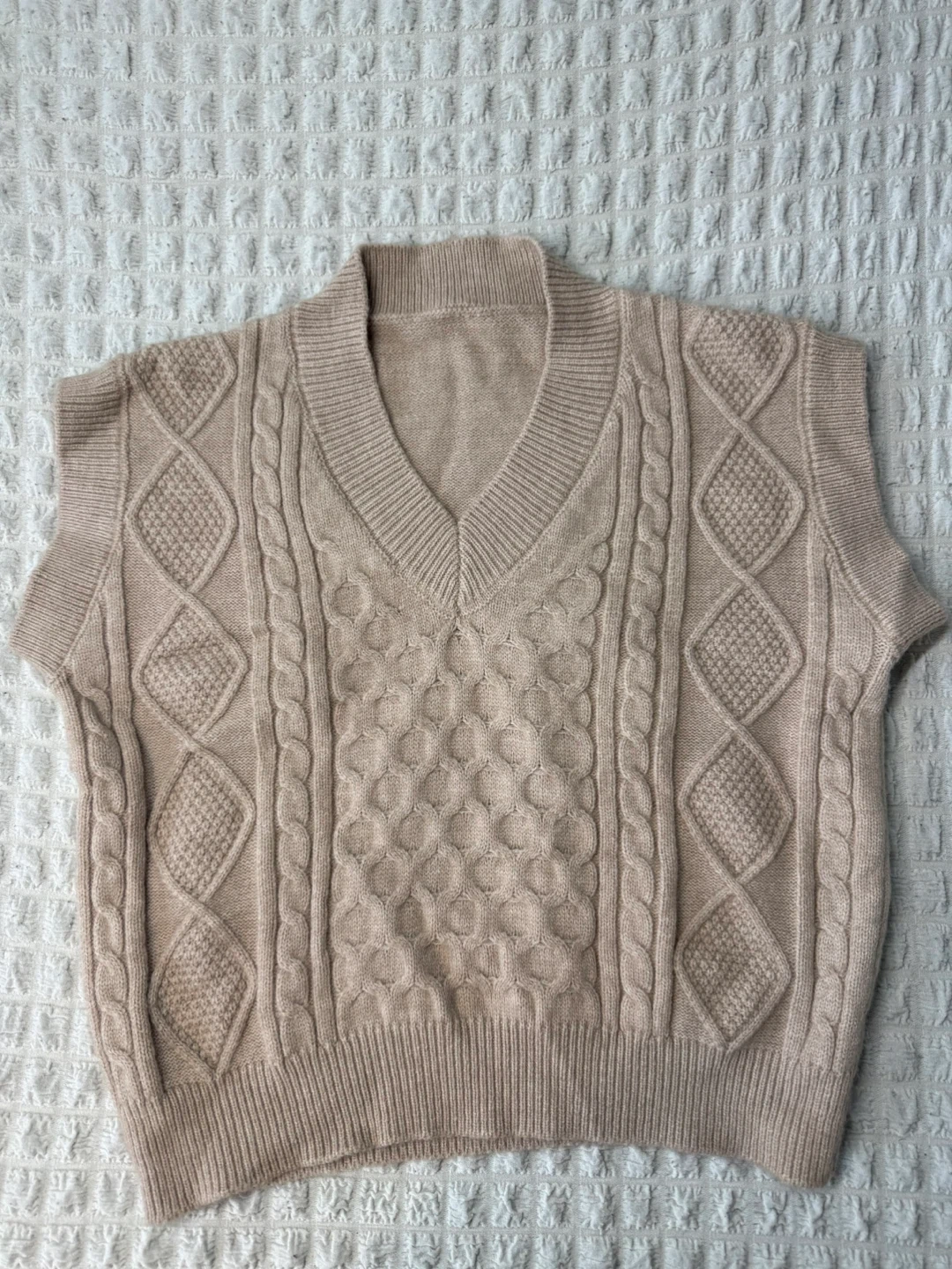 A stylish beige cable knit sweater vest with a V-neck. It features a cable knit pattern with diamond and circular designs. This vest is sleeveless and has a ribbed hem and collar. It's perfect for layering over shirts or blouses.