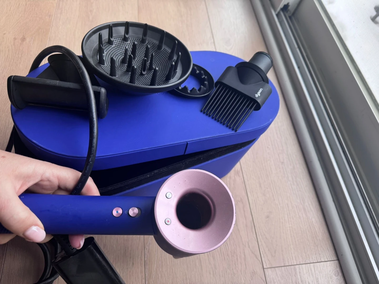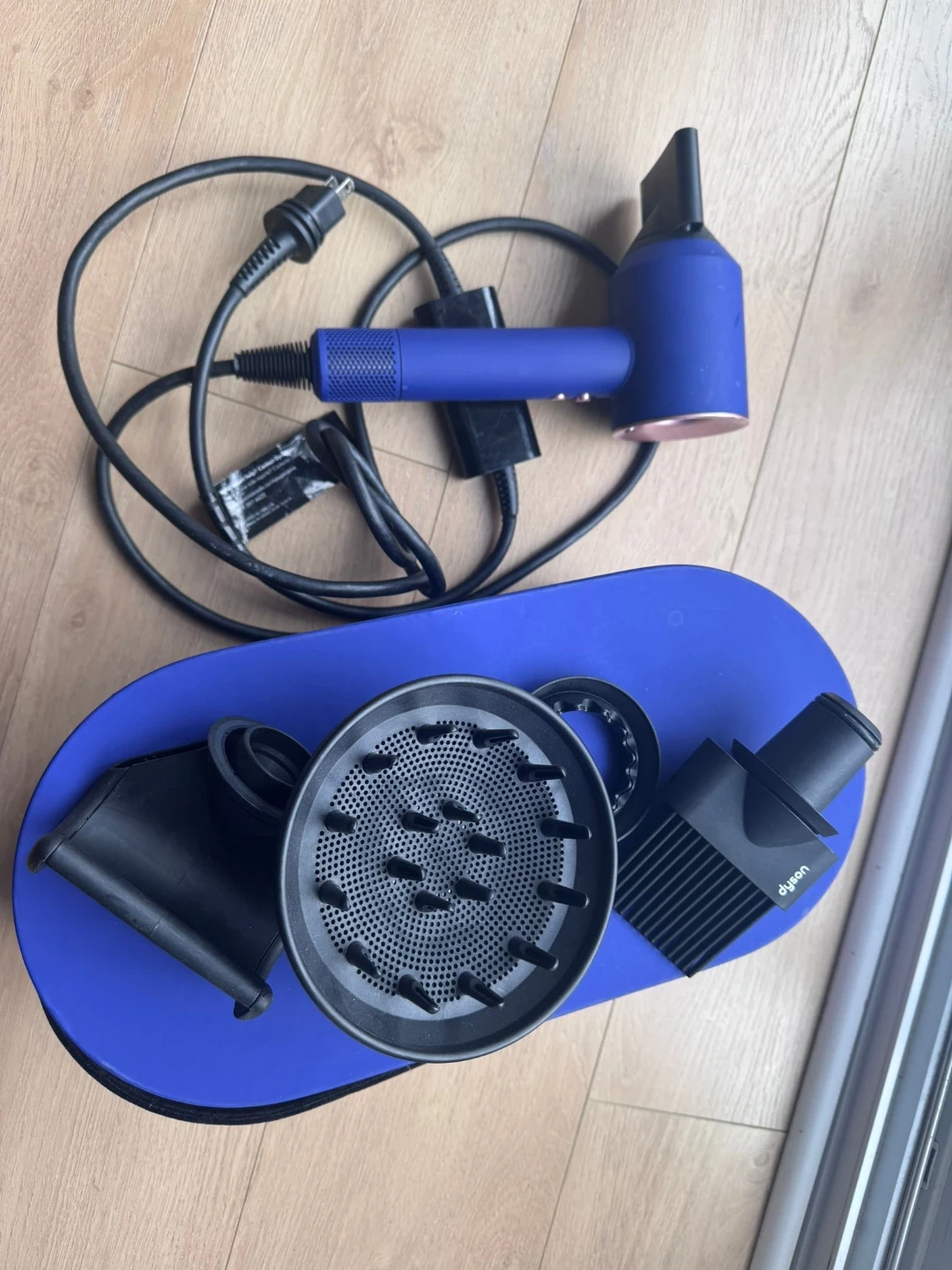 Selling a Dyson Supersonic hair dryer in blue and pink! It comes with all the attachments and the original box. It's in great condition and ready for a new home. It is lightweight and portable