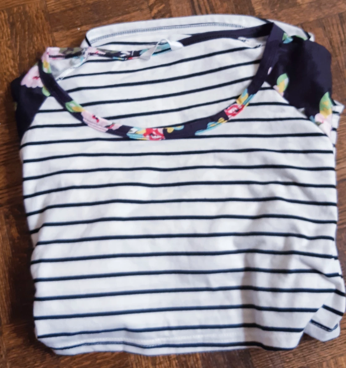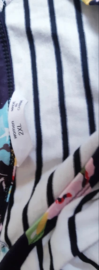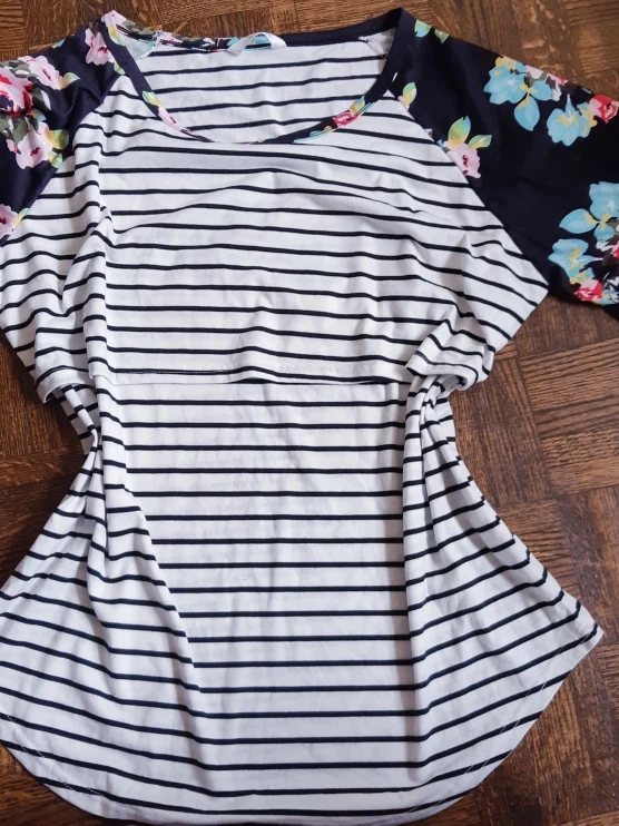 Selling a cute women's top with a striped body and floral sleeves. It's a size 2XL and in great condition! The stripes are black and white, and the floral pattern has a dark navy background with pink, yellow, and green flowers