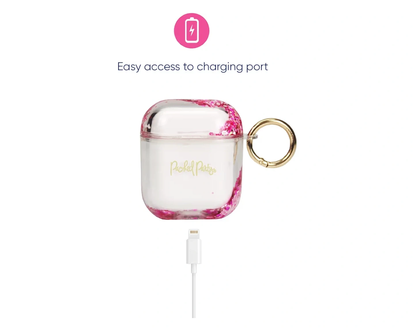 This clear case cover is compatible with 1st and 2nd generation AirPods. It has a colourful glitter design and includes a detachable snap hook for easy carrying. It also offers easy access to the charging port.