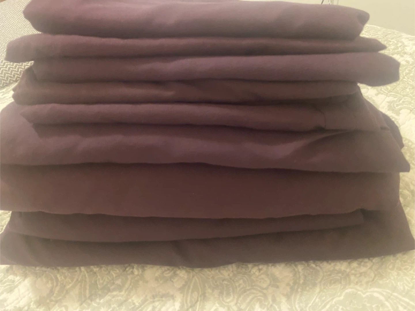 Two sets of plum purple bed sheets. Material is a soft microfibre Includes two flat sheets and two fitted sheets and 6 pillow cases. Perfect for giving your bedroom a fresh look!