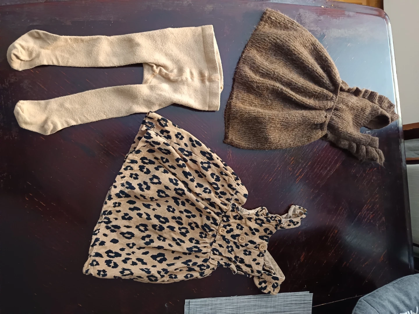 This is a cute set for a toddler. It includes a leopard print dress with ruffled details. Also included are a pair of tan tights and a brown knit sweater with ruffles. It's a sweet outfit for a little one!