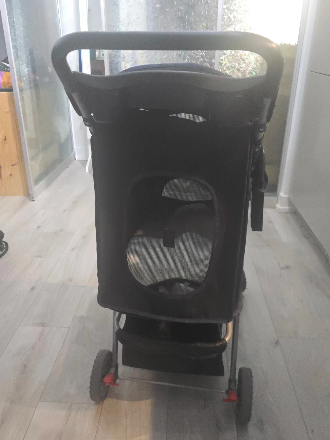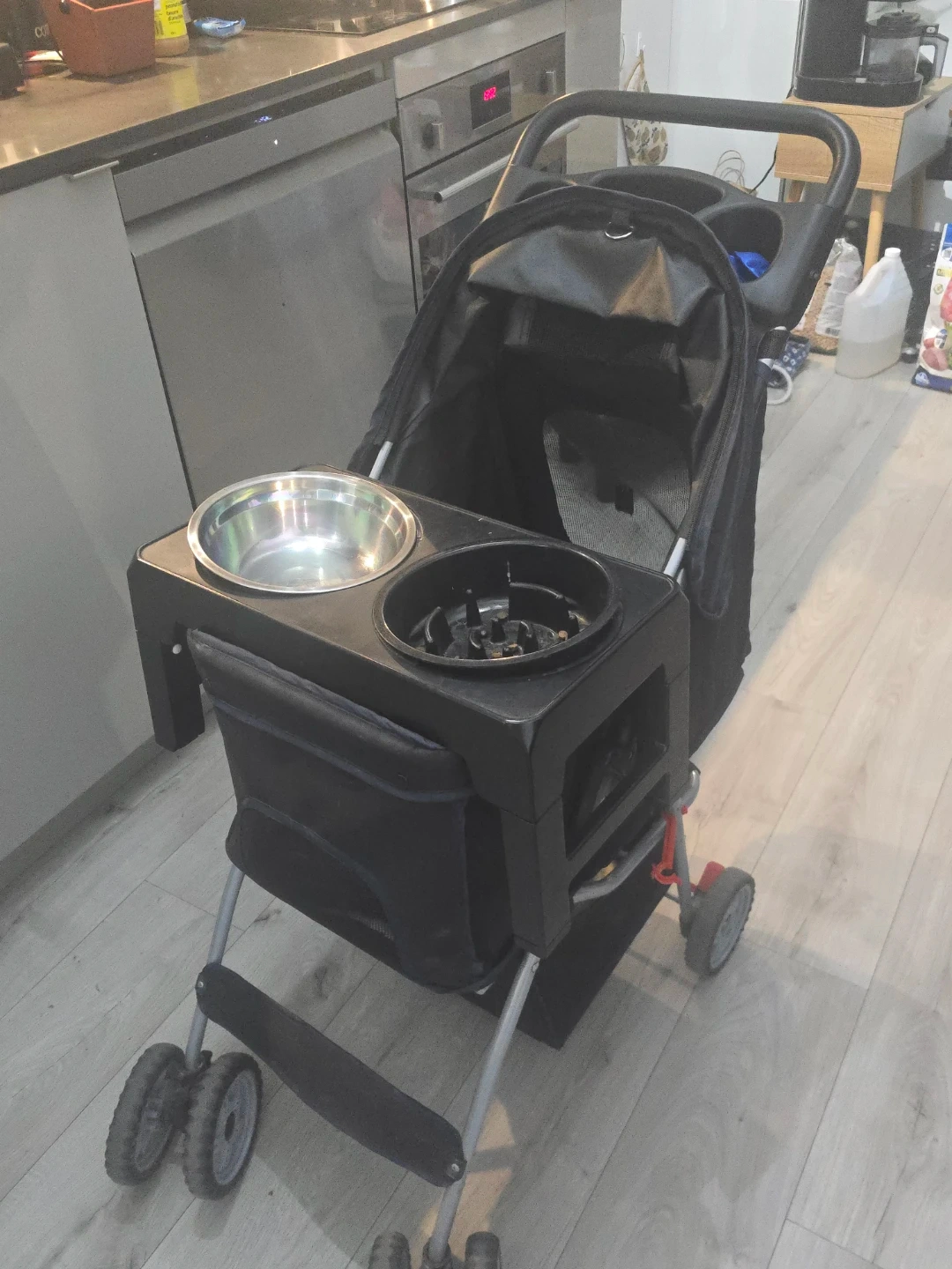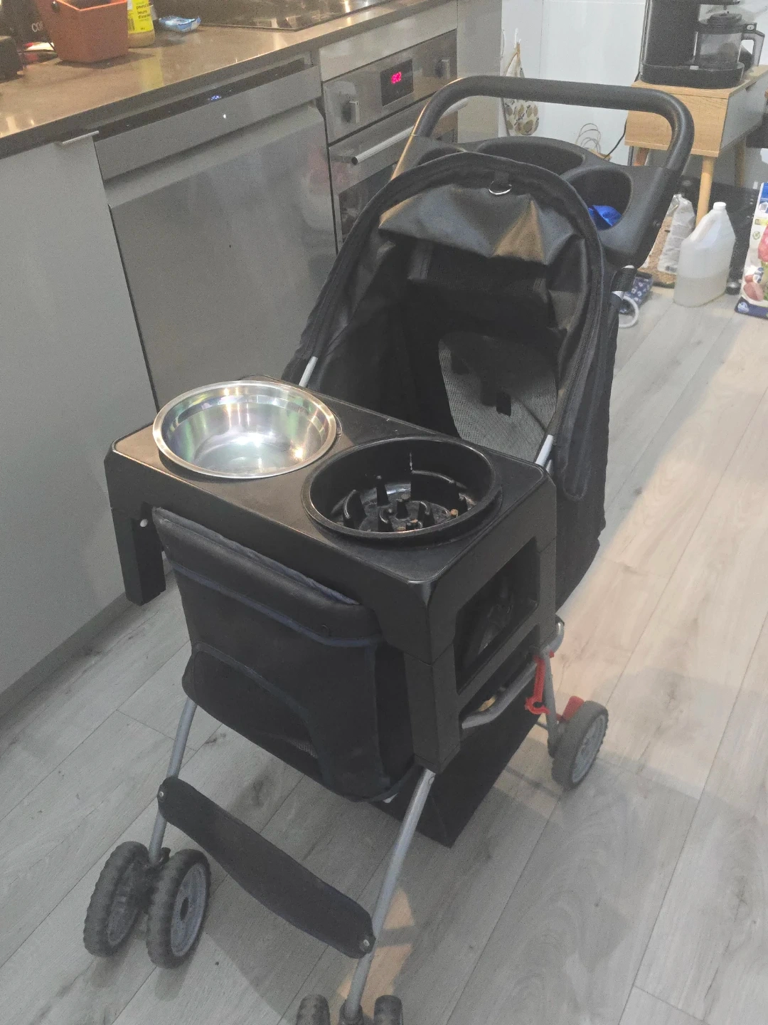 It's designed for easy transport of small pets. The stroller features mesh windows for ventilation. It's a practical option for taking your furry friend on walks or trips! Includes two bowls for food and water as well. Needs some cleaning, but completely functional.