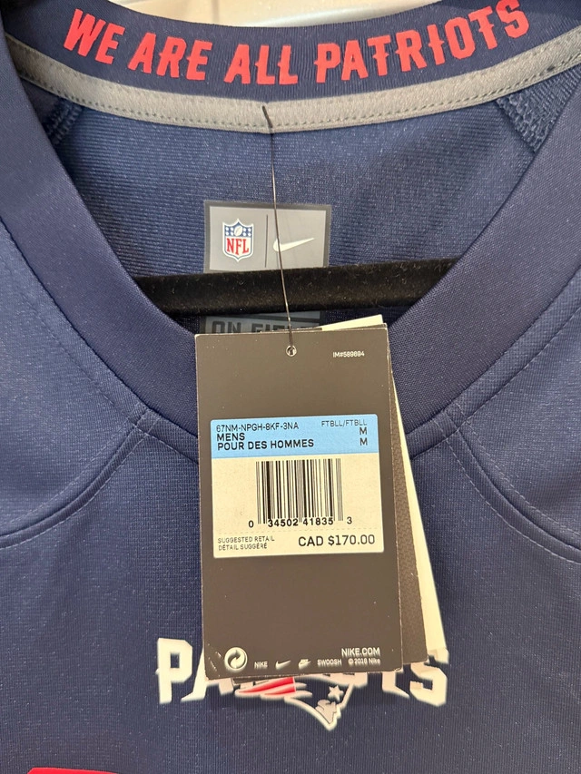Get ready to show your team spirit with this brand new Nike New England Patriots Mac Jones #10 Jersey, complete with tags! This jersey is in pristine condition, ready for game day or to add to your collection. Key features include: - Official Nike NFL gear - New with tags - Size: M - Player: Mac Jones #10 - Team: New England Patriots Whether you're heading to Gillette Stadium or watching from home, this jersey will make you feel like part of the team! If the ad's still up, it's still available! Cash only. Meet up in Quarry Park SE or Mahogany SE