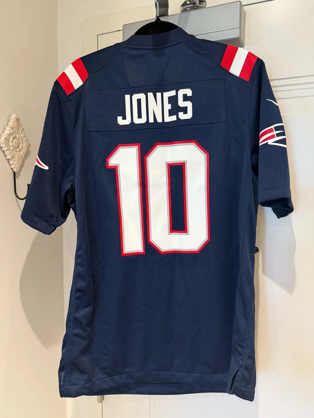 Get ready to show your team spirit with this brand new Nike New England Patriots Mac Jones #10 Jersey, complete with tags! This jersey is in pristine condition, ready for game day or to add to your collection. Key features include: - Official Nike NFL gear - New with tags - Size: M - Player: Mac Jones #10 - Team: New England Patriots Whether you're heading to Gillette Stadium or watching from home, this jersey will make you feel like part of the team! If the ad's still up, it's still available! Cash only. Meet up in Quarry Park SE or Mahogany SE