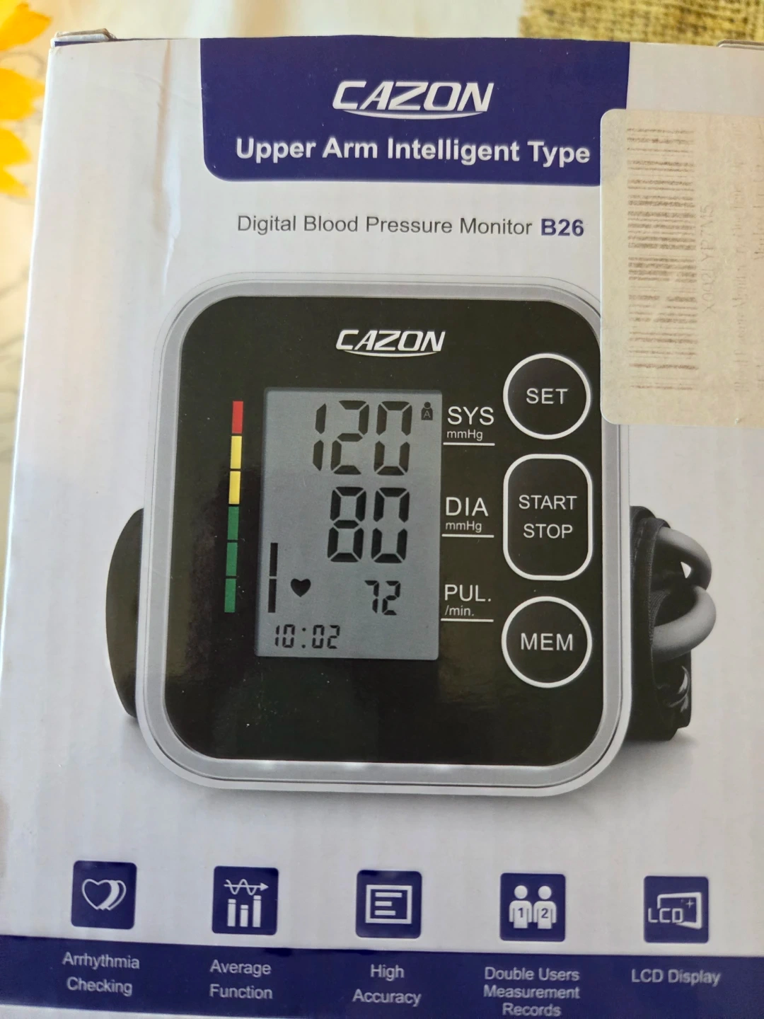 This is a CAZON Upper Arm Intelligent Type Digital Blood Pressure Monitor B26. It features arrhythmia checking, high accuracy, and a 2*120 groups memory for double users. The cuff perimeter is 22-40cm. 4 AAA batteries. no plug-in cord. but easy to attain. DC5V-usb