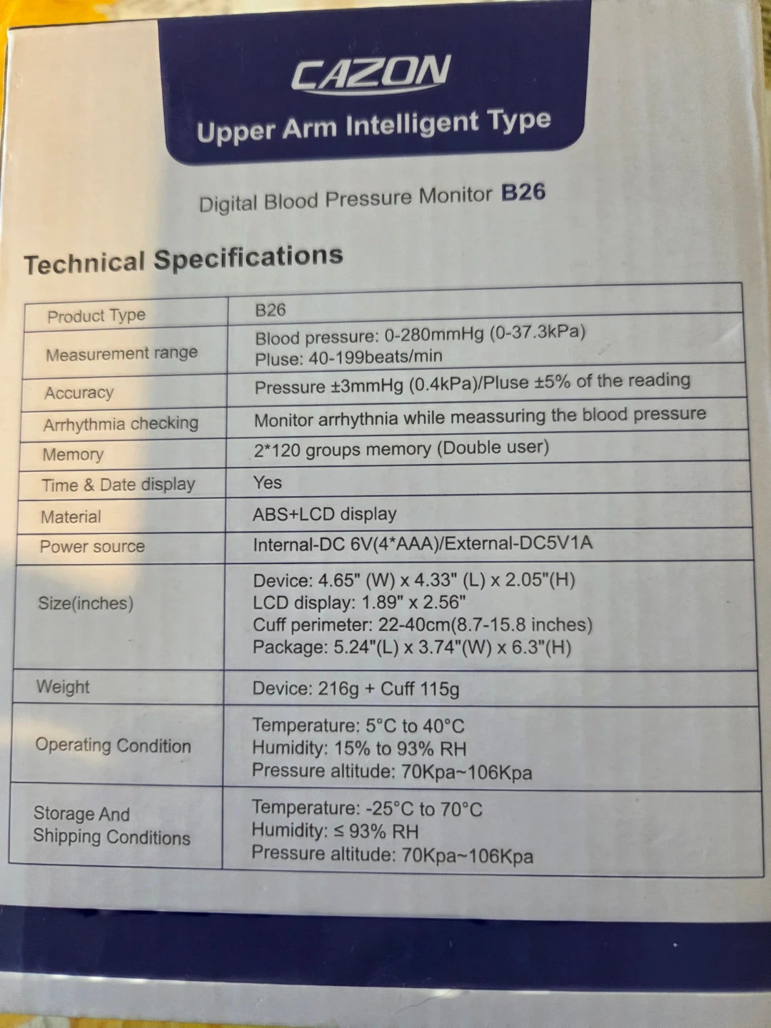 This is a CAZON Upper Arm Intelligent Type Digital Blood Pressure Monitor B26. It features arrhythmia checking, high accuracy, and a 2*120 groups memory for double users. The cuff perimeter is 22-40cm. 4 AAA batteries. no plug-in cord. but easy to attain. DC5V-usb