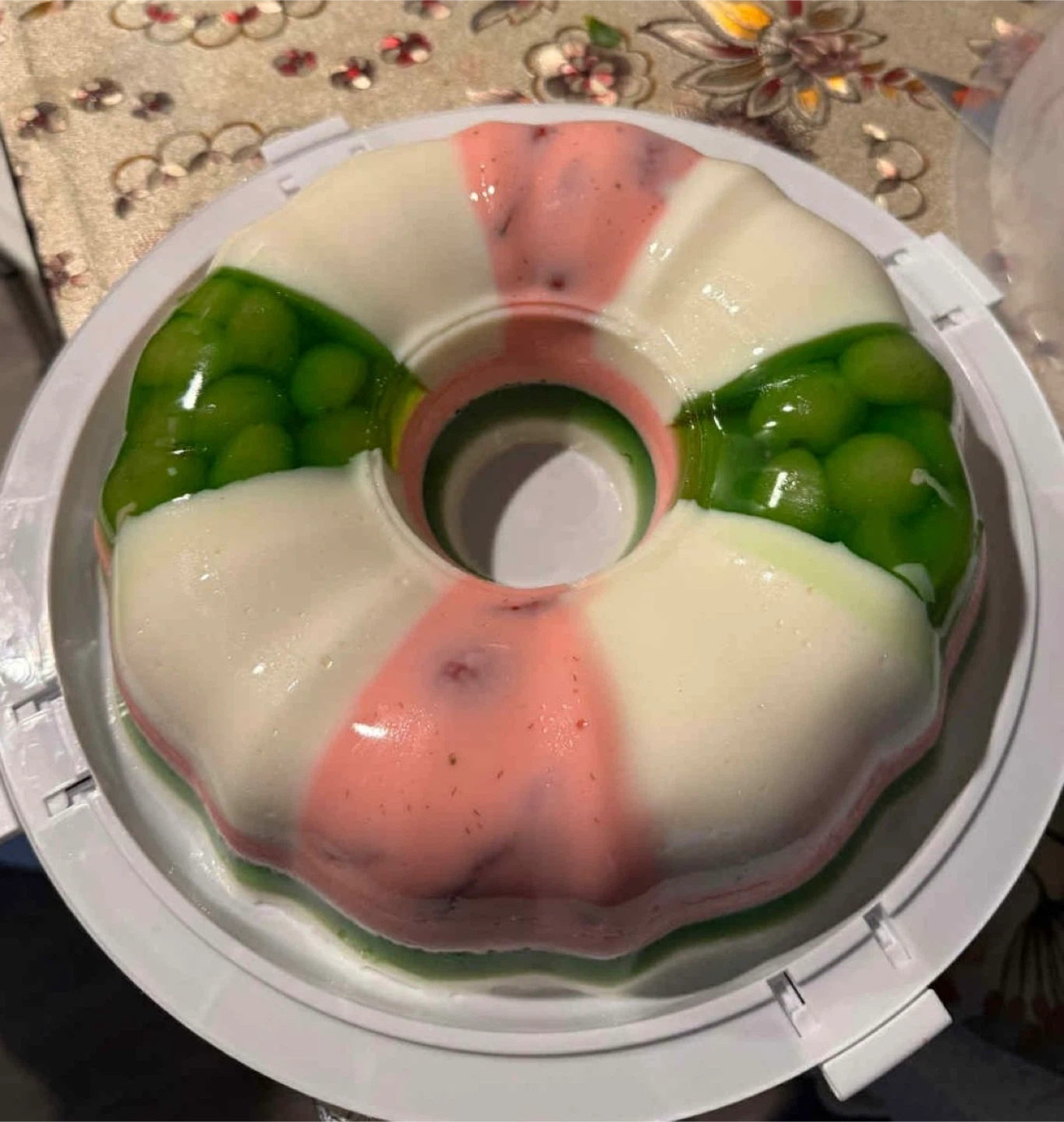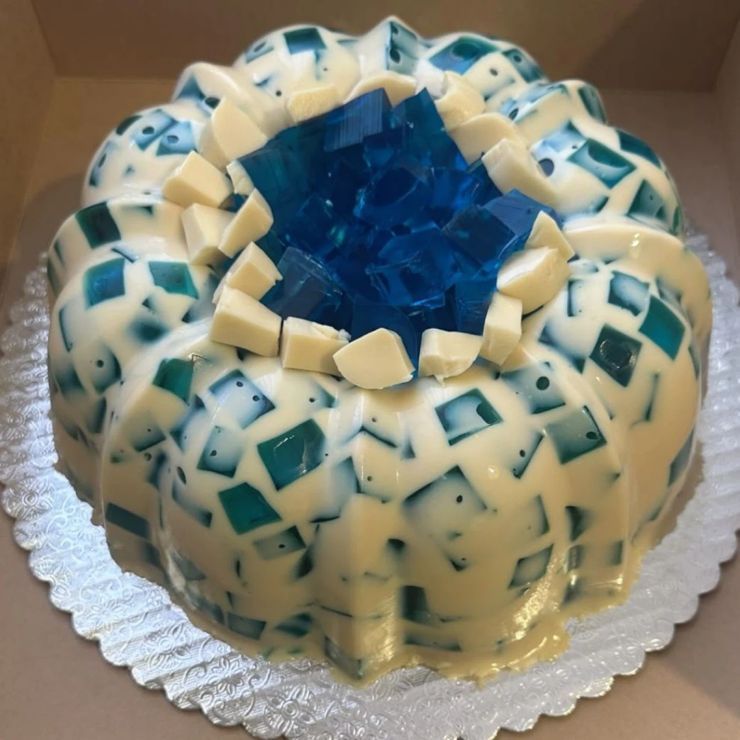 This assortment features several homemade desserts. Includes a chocolate Oreo cheesecake and various gelatin desserts with colorful fruit pieces. Perfect for parties or celebrations!