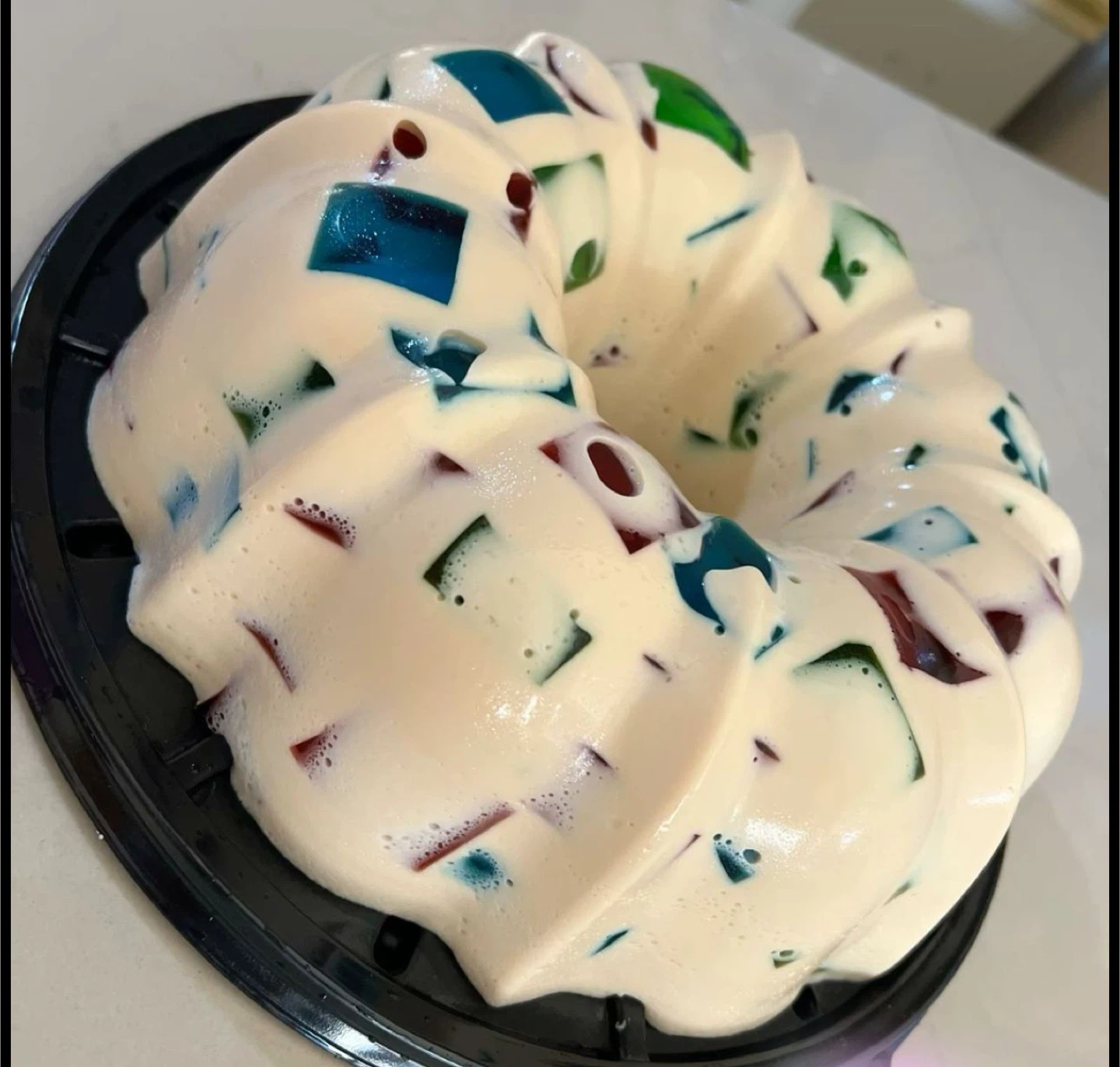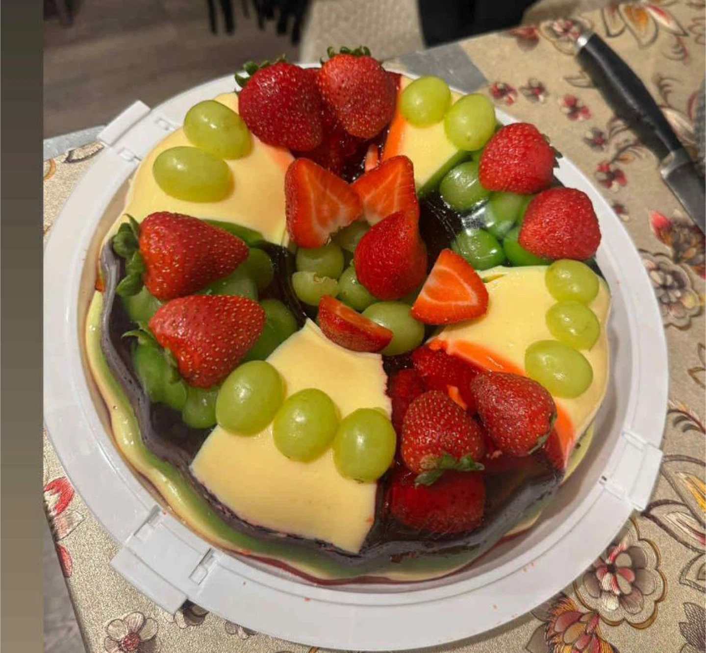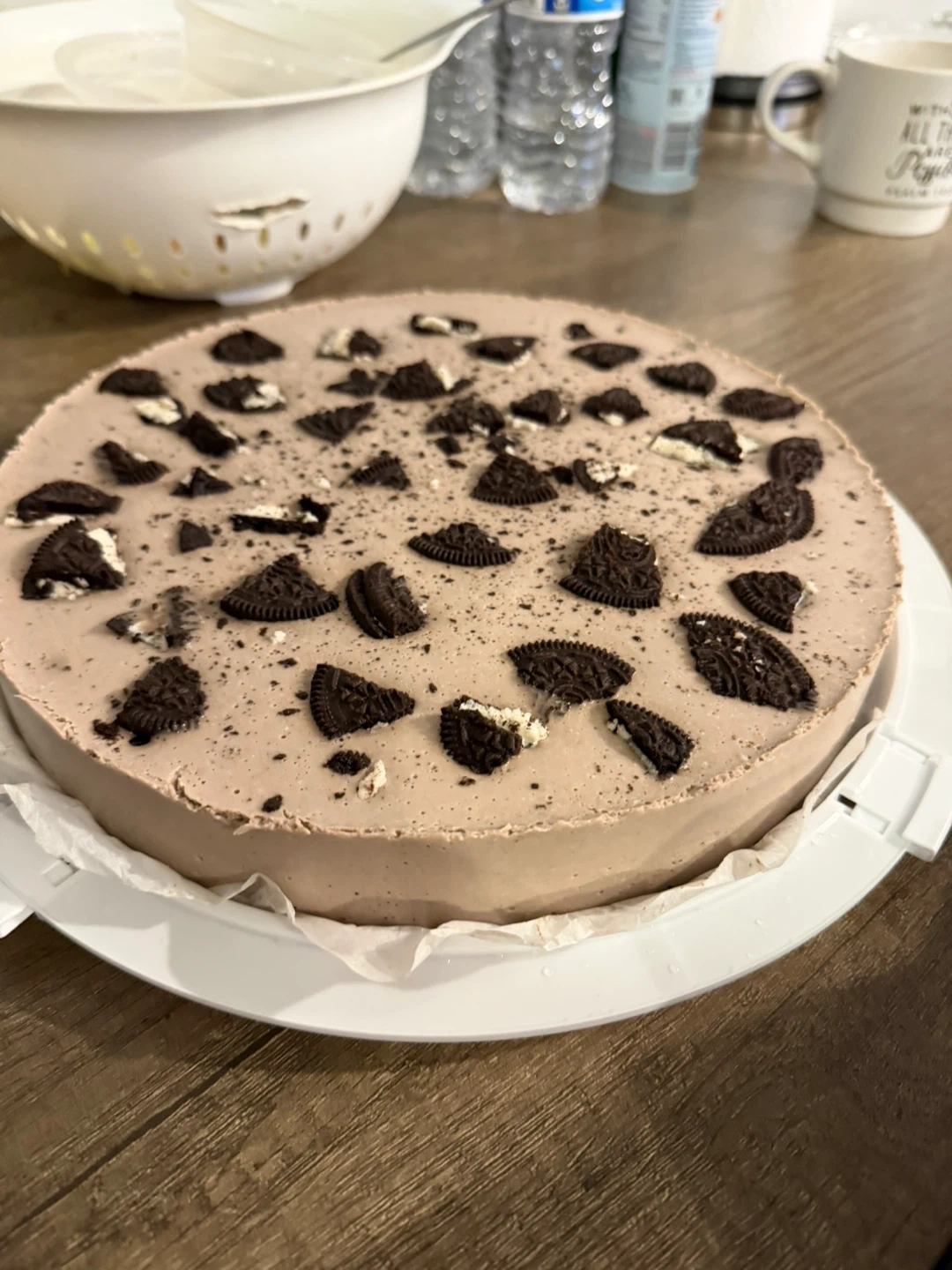 This assortment features several homemade desserts. Includes a chocolate Oreo cheesecake and various gelatin desserts with colorful fruit pieces. Perfect for parties or celebrations!
