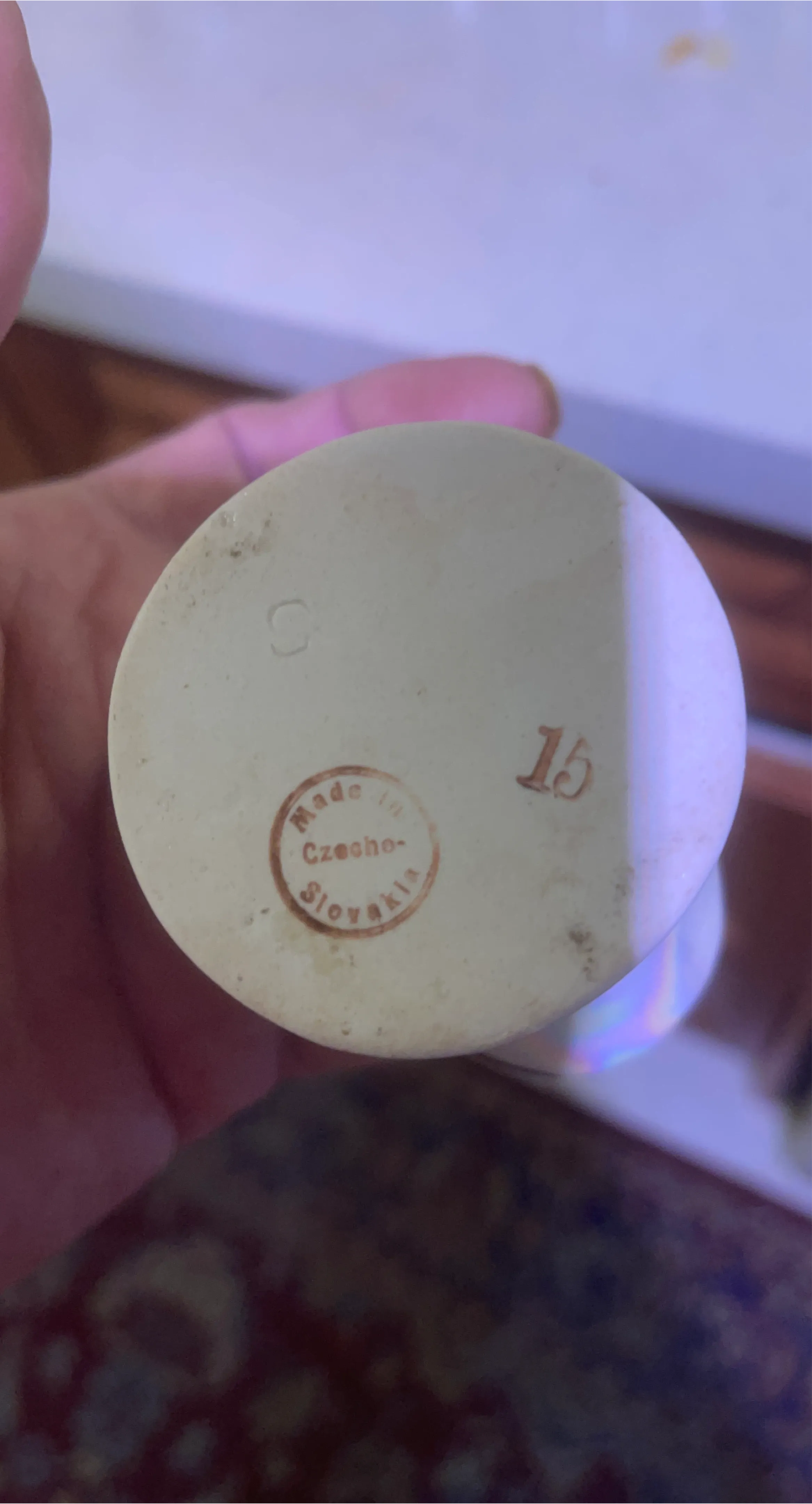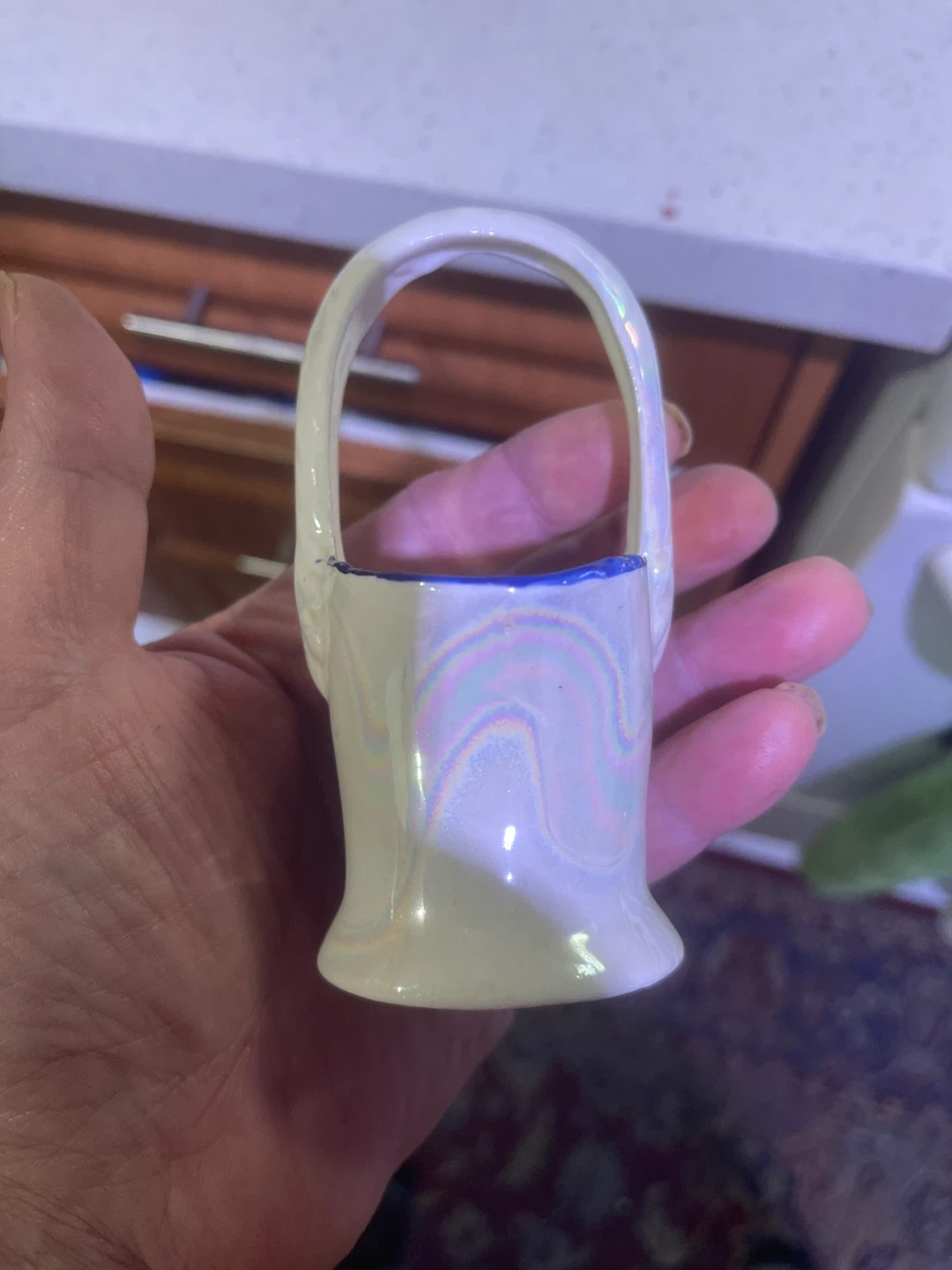 This is a charming ceramic basket, made in Czechoslovakia. It features a pearlescent finish and a decorative handle. It's a lovely piece for display or holding small trinkets.