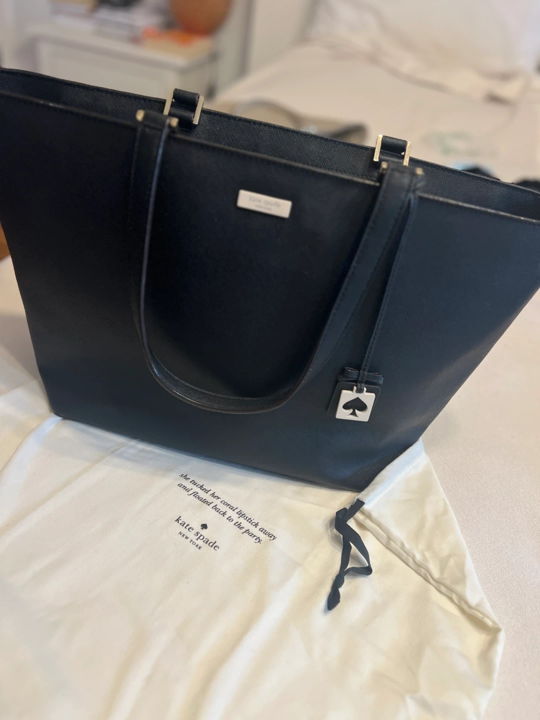 Selling a Kate Spade tote bag in black! It's in great condition and perfect for everyday use. The interior lining has the Kate Spade logo. Comes with the original dust bag