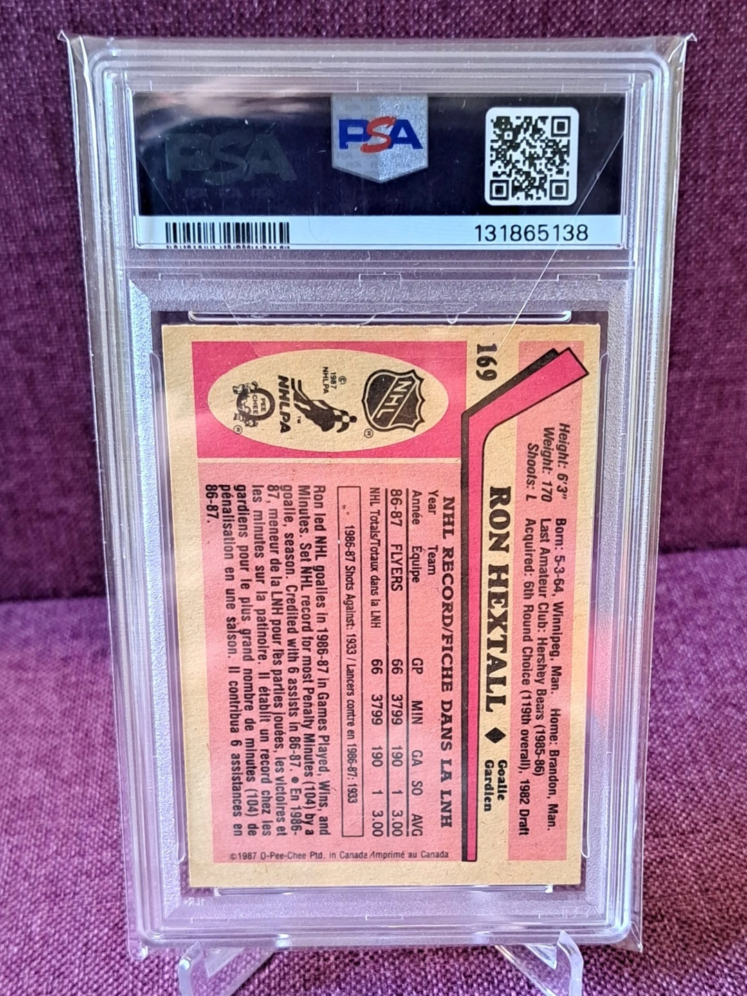 This is a standard size, original 1987 O-Pee-Chee NHL trading card featuring Ron Hextall of the Philadelphia Flyers. It is card number 169 from the 1987-88 season and has been professionally graded by PSA with a grade of 5. The card is made of card stock and is not autographed.
