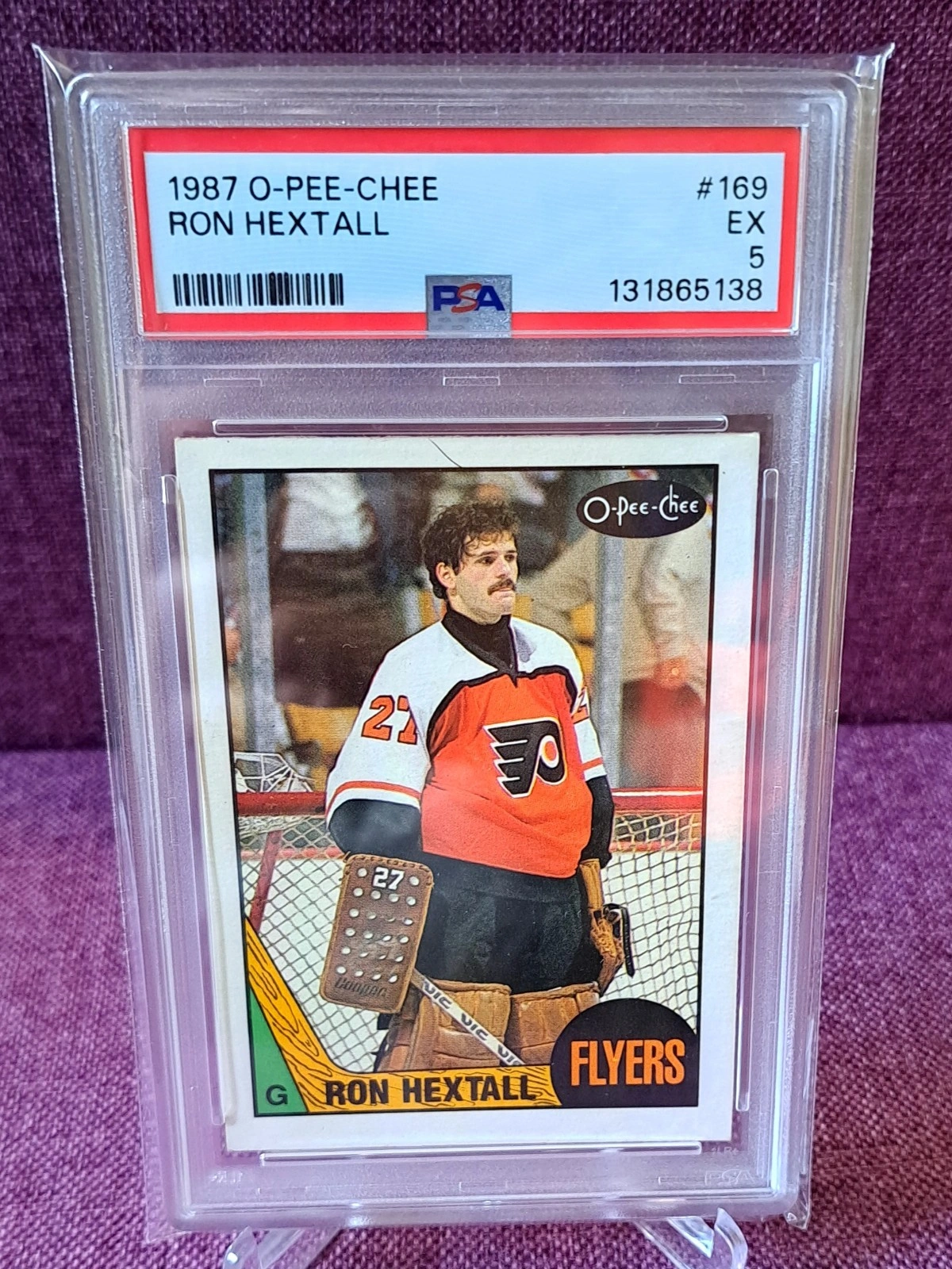 This is a standard size, original 1987 O-Pee-Chee NHL trading card featuring Ron Hextall of the Philadelphia Flyers. It is card number 169 from the 1987-88 season and has been professionally graded by PSA with a grade of 5. The card is made of card stock and is not autographed.