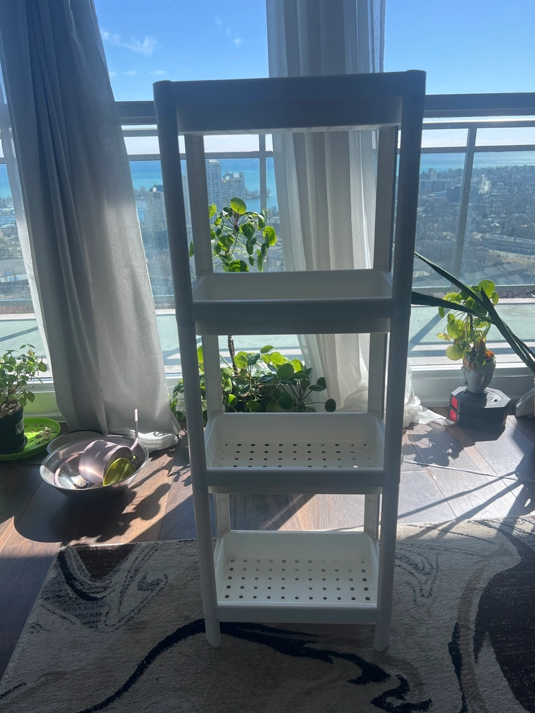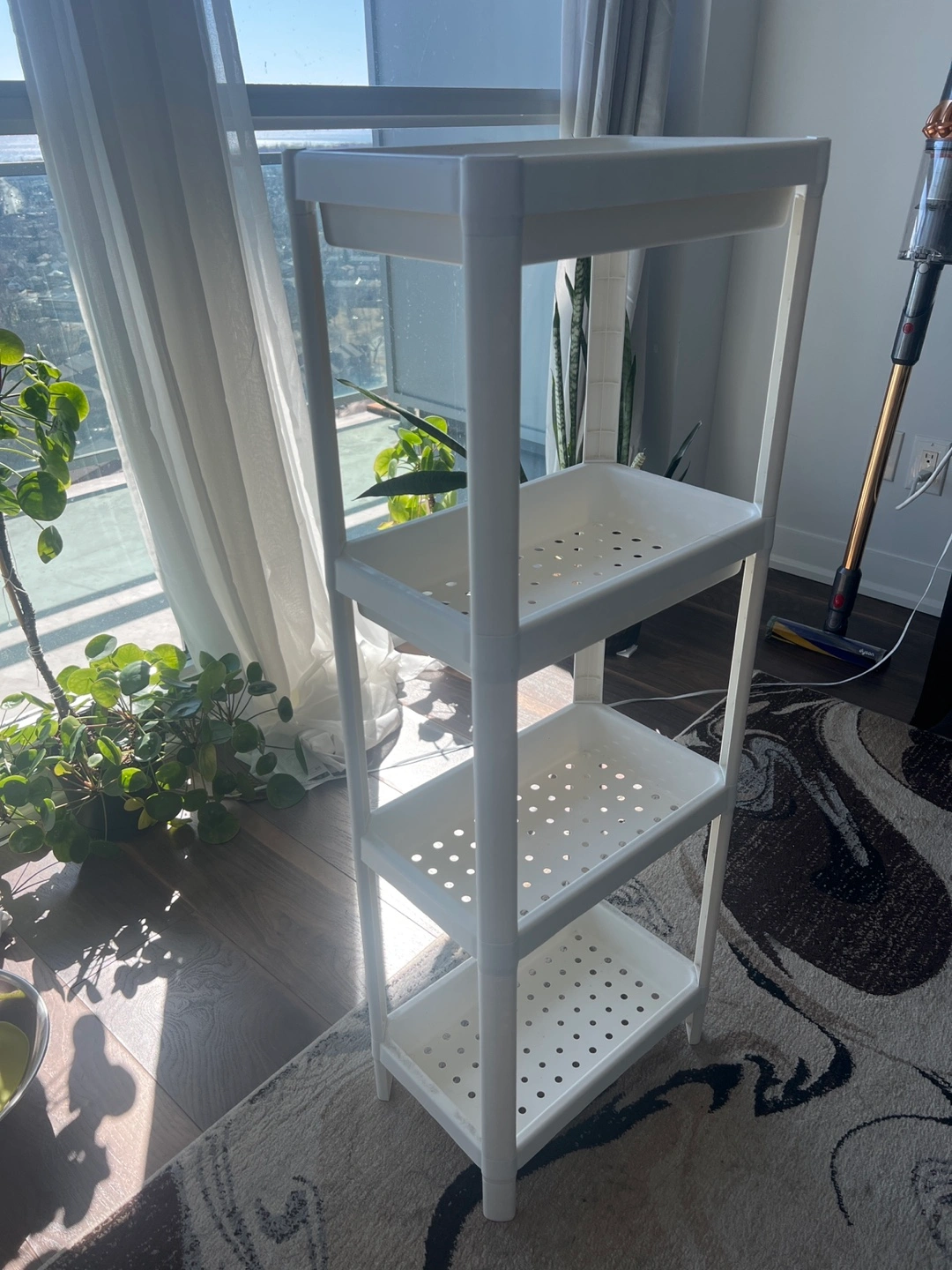 Versatile storage solution. Three shelves offer ample space. Ideal for bathroom, kitchen, or pantry. Lightweight and easy to assemble. Durable plastic construction. Perfect for organizing toiletries, spices, or other household items.