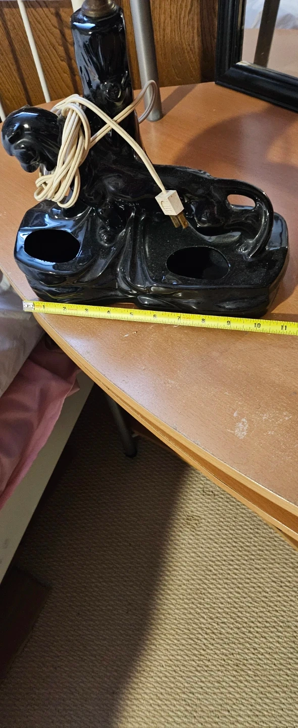 This vintage lamp features a black ceramic panther design. It's approximately 11 inches long and 4 inches high at the base. The lamp has two circular openings in the base, possibly for ashtrays. It's a unique accent piece for any room!