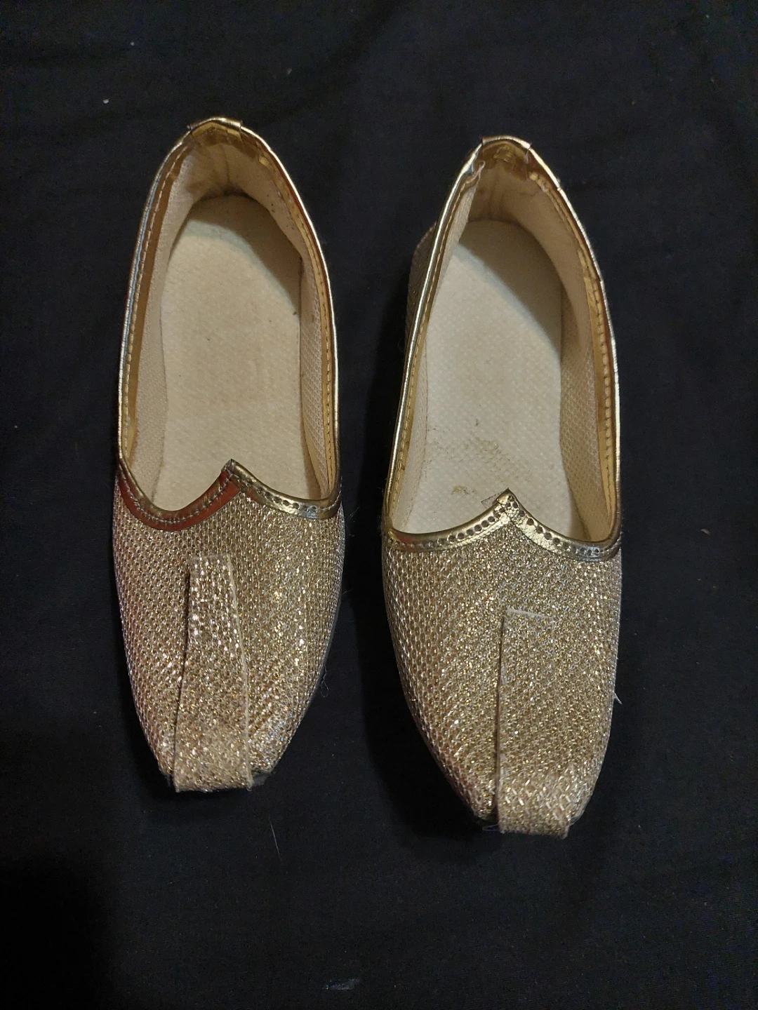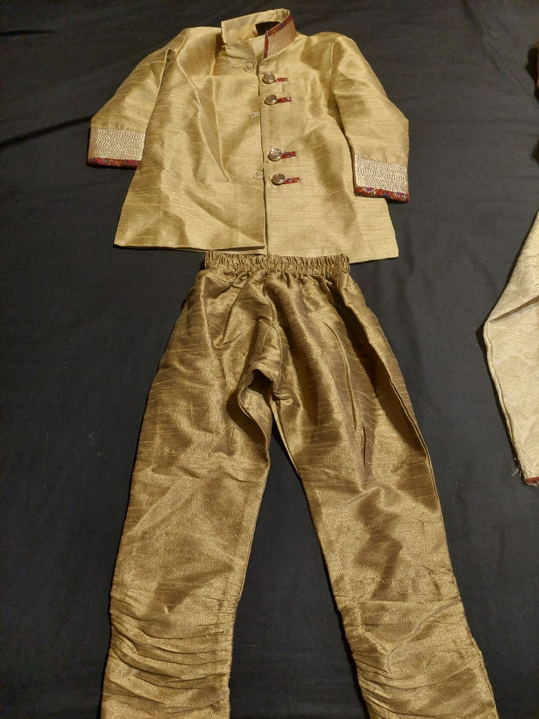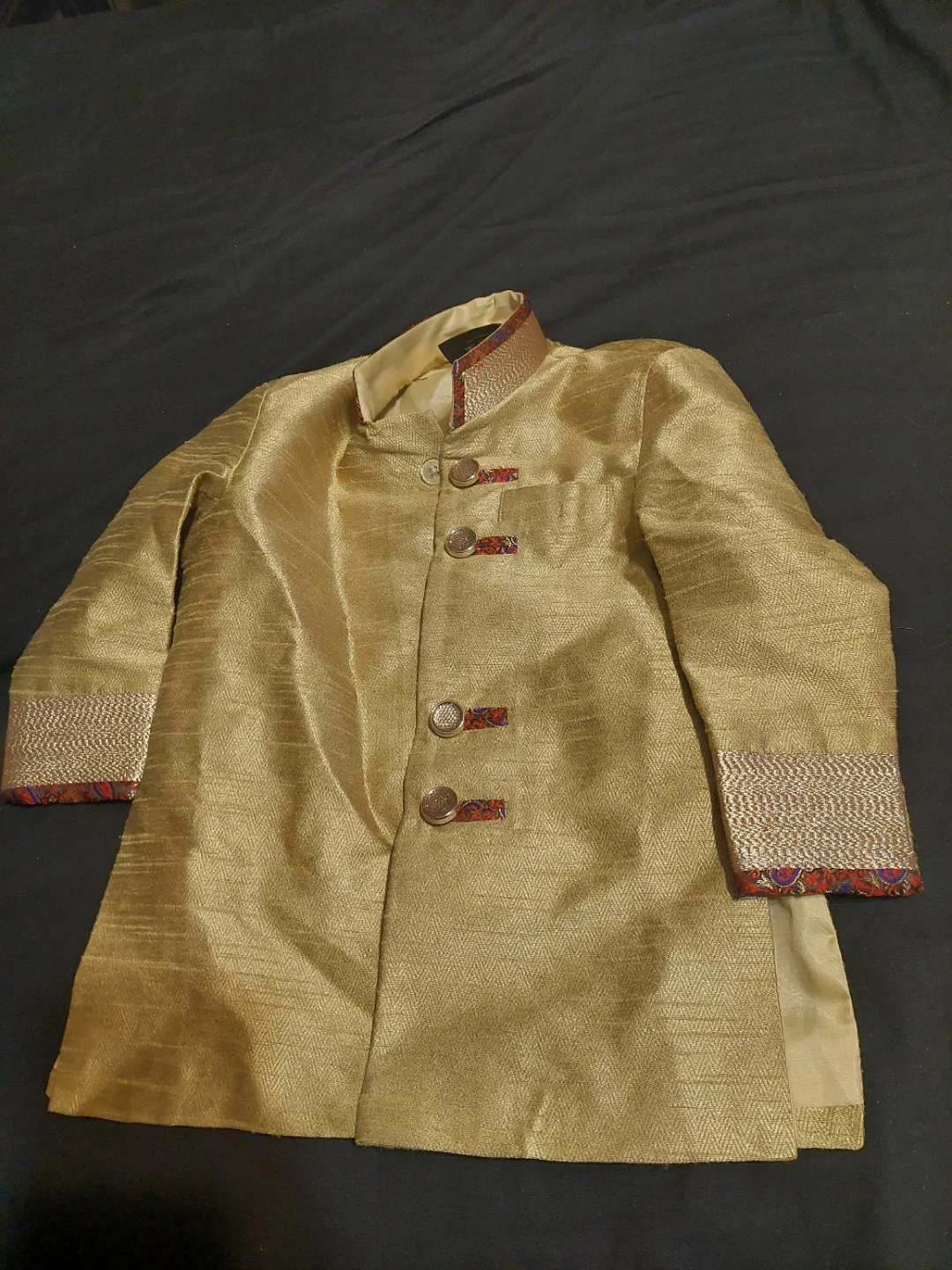 This is a boys' gold sherwani and pants set. It's made of a shimmery fabric with ornate trim on the collar, cuffs, and button placket. Matching gold slip-on shoes are included.