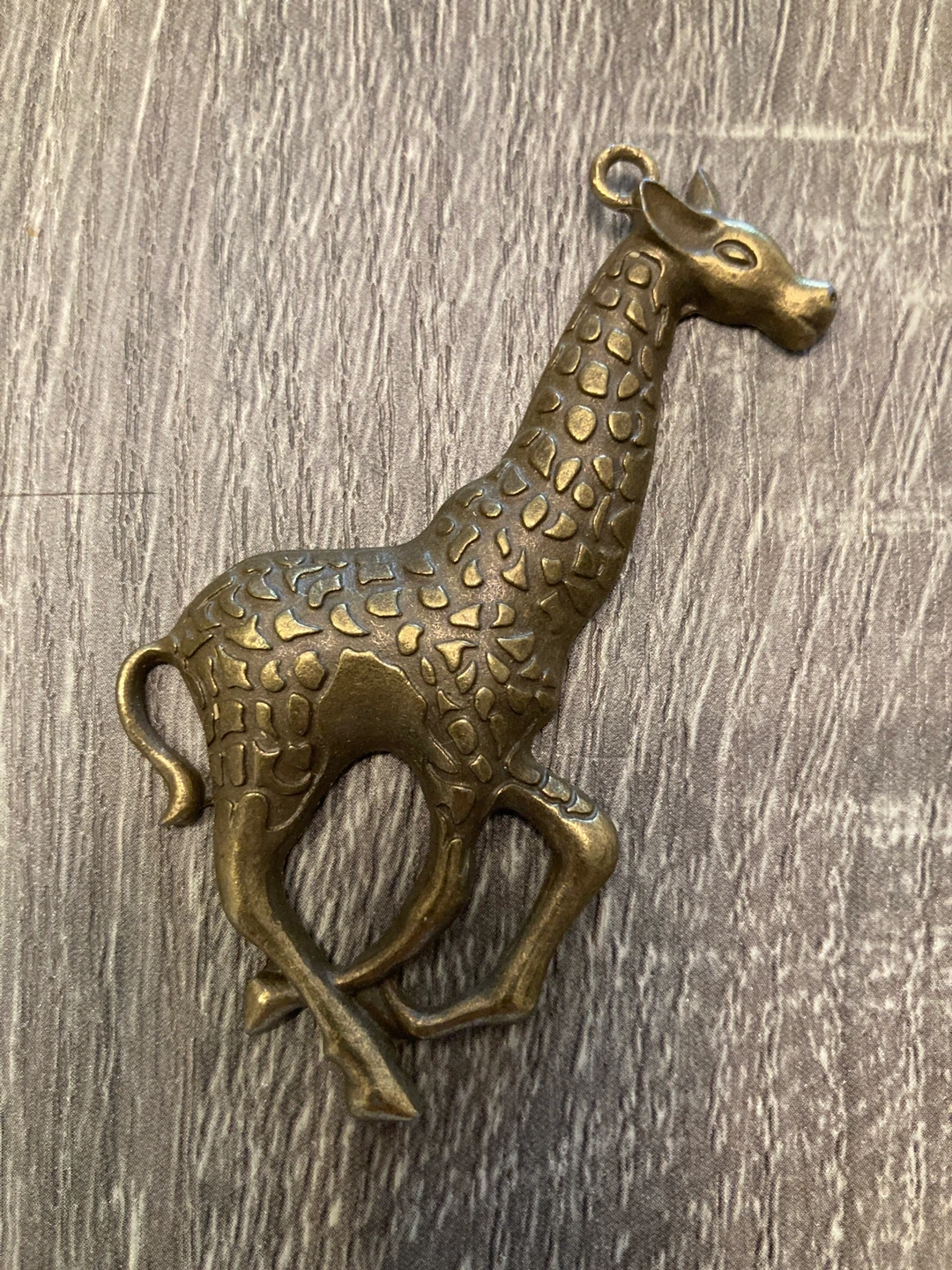 A detailed brass pendant shaped like a running giraffe. It features a textured, antique-like finish. It has a small loop at the top for attaching to a chain or cord. This piece would make a lovely addition to a necklace or bracelet.