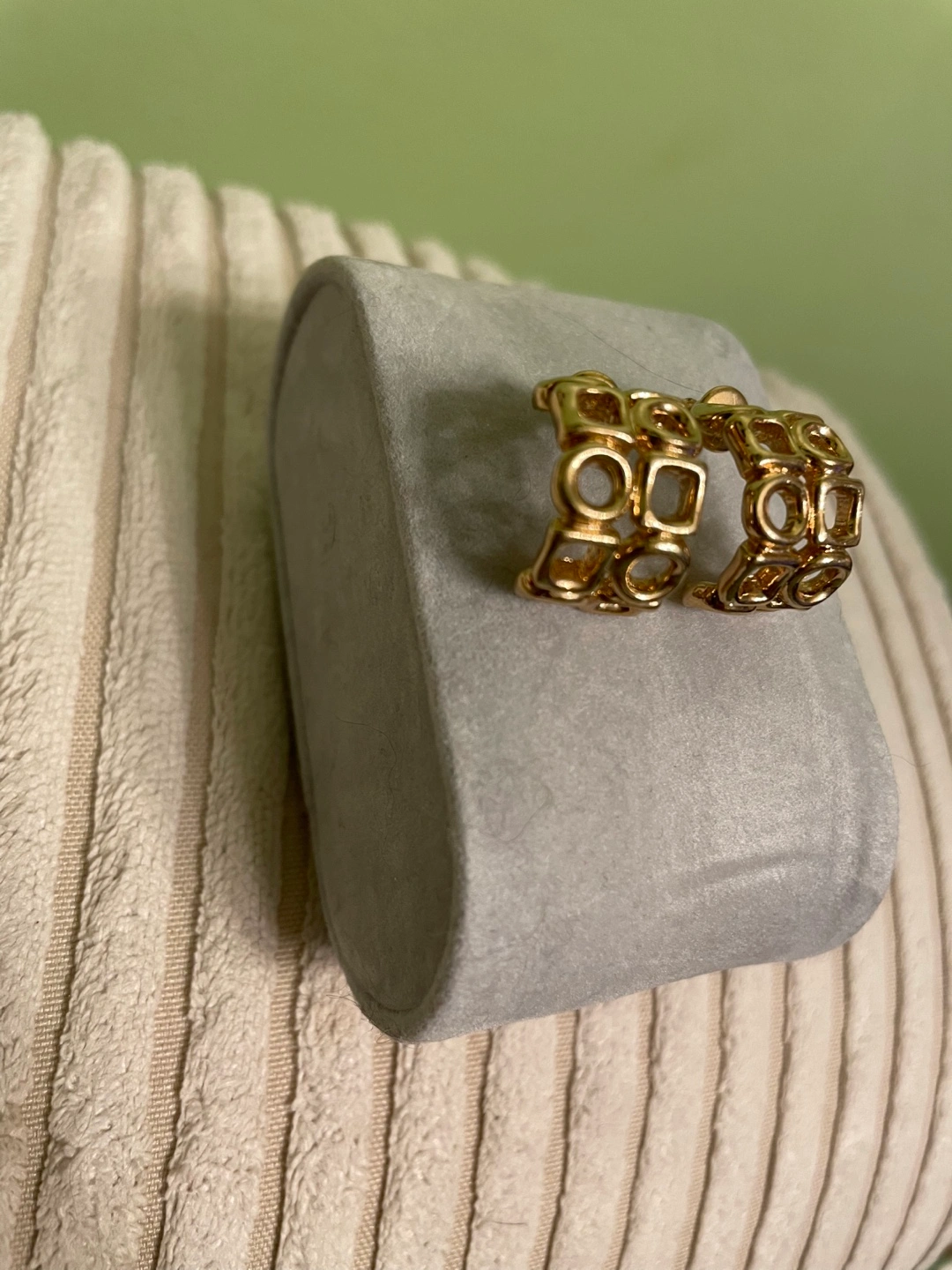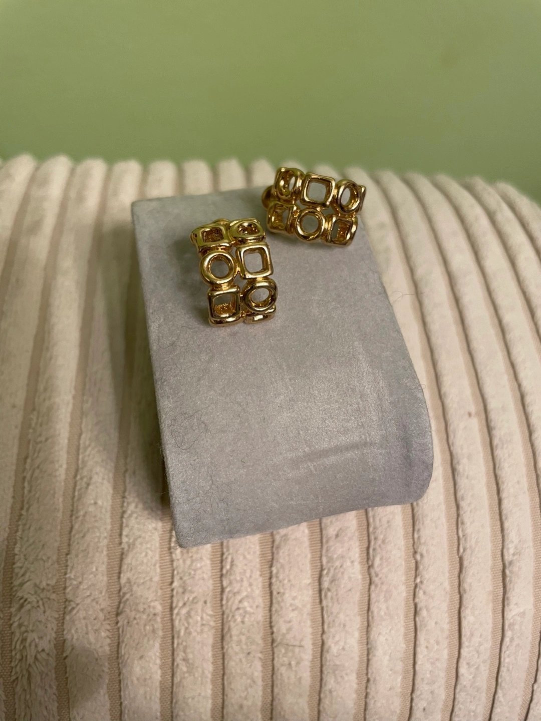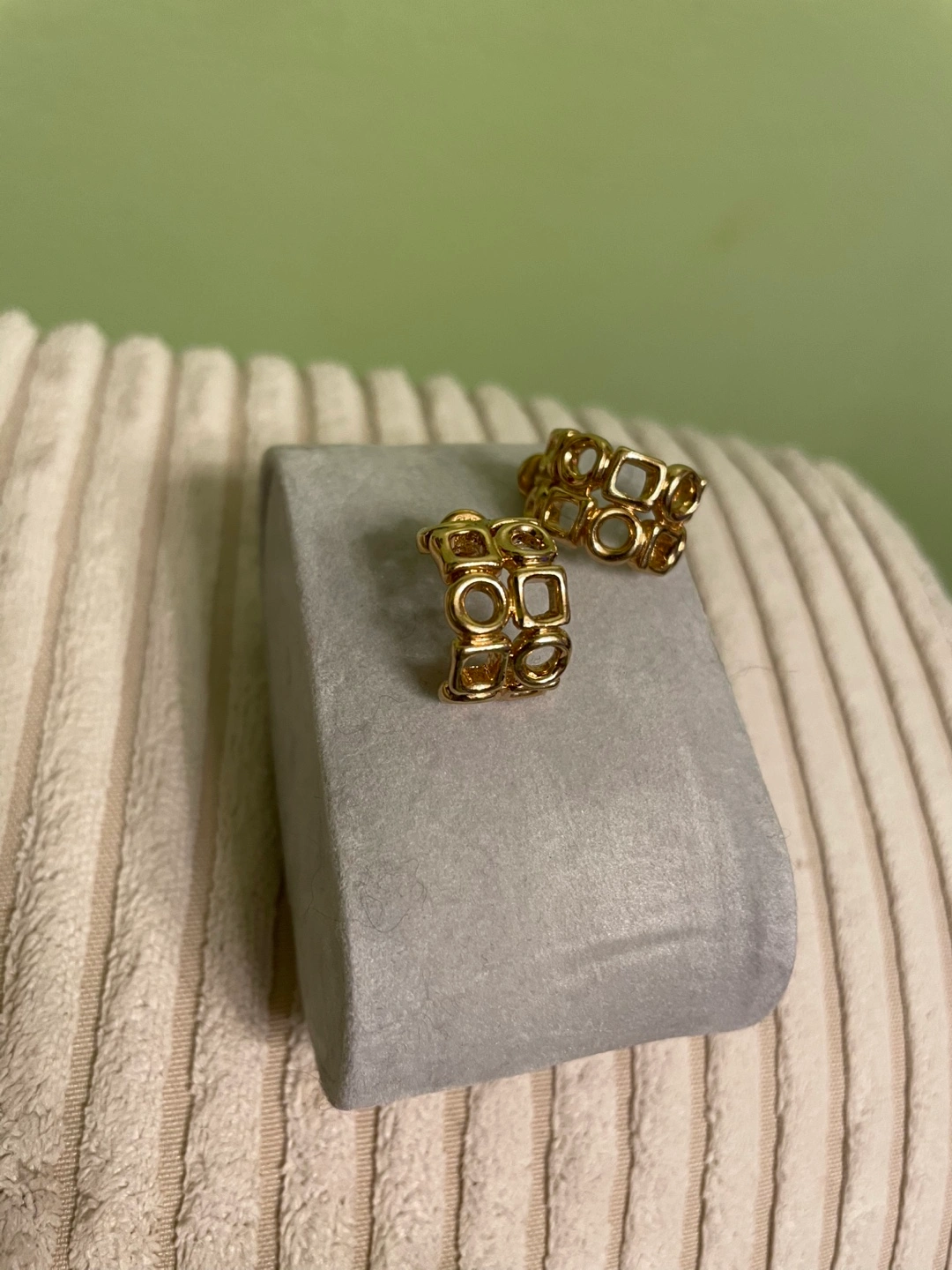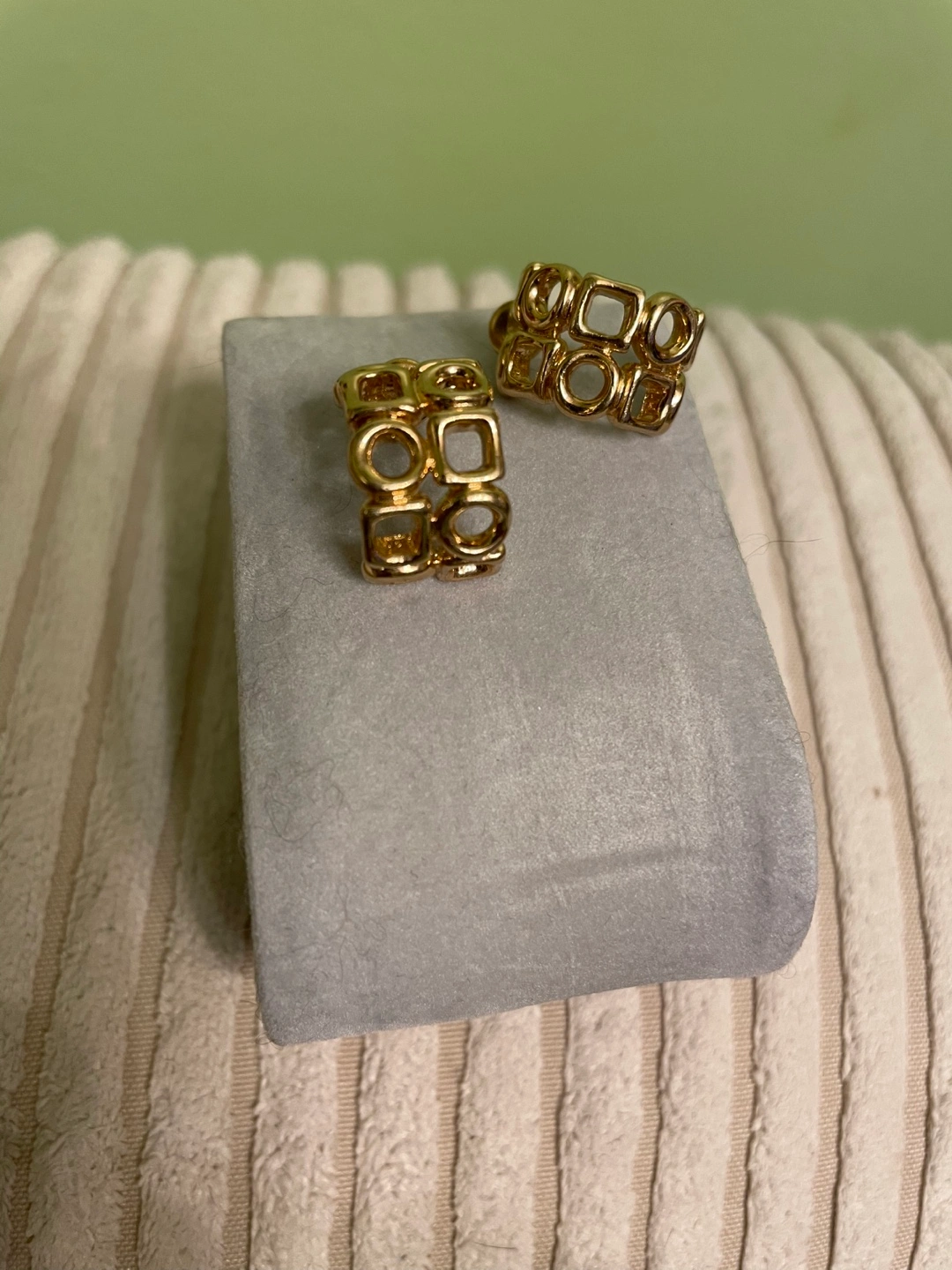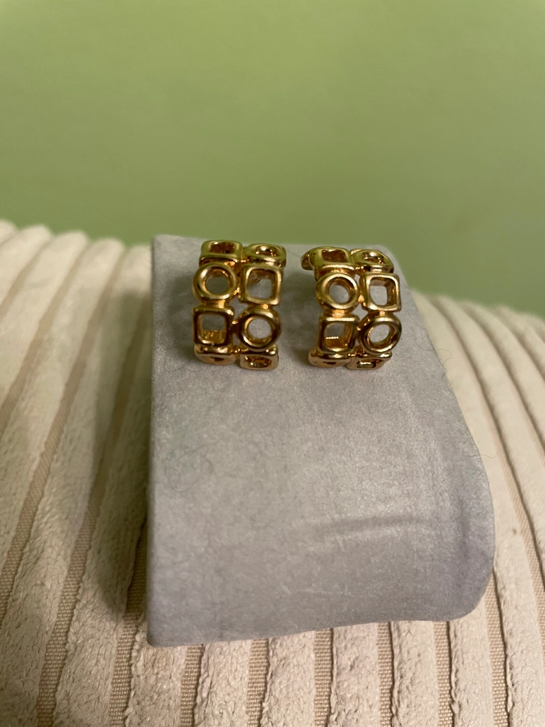 Pair of gold-toned metal hoop earrings. Features repeating geometric cut-outs. Post back closure. Elegant and stylish.