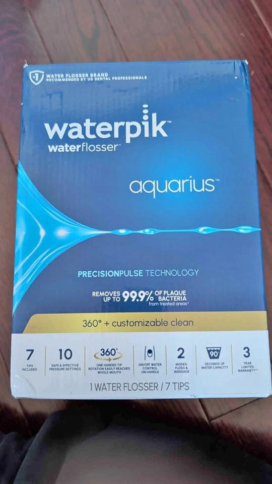 New Waterpik Aquarius Waterflosser with 7 tips included and 10 pressure settings. Features 2 modes: floss and massage. Includes on/off water control on the handle and 360-degree tip rotation for easy reach. Great for a thorough clean!