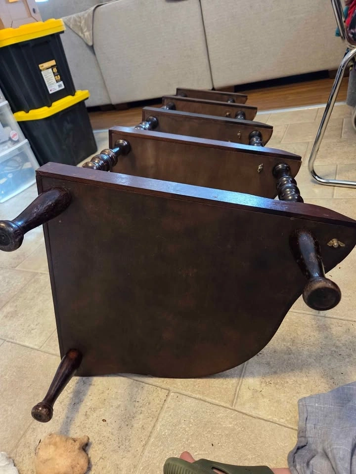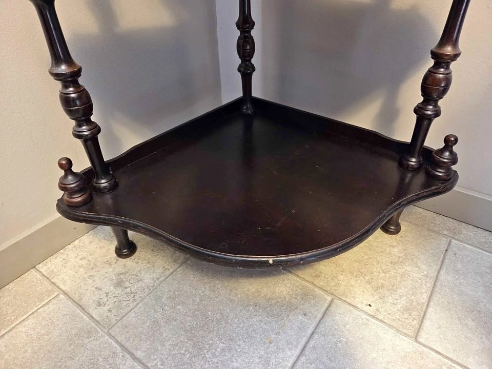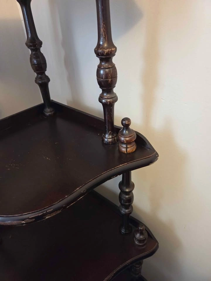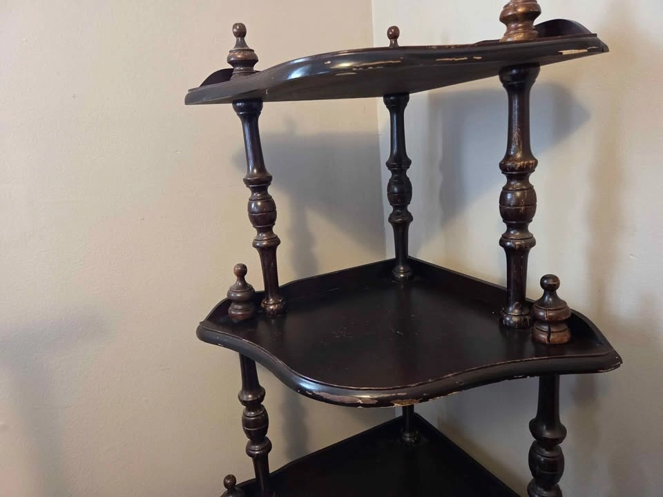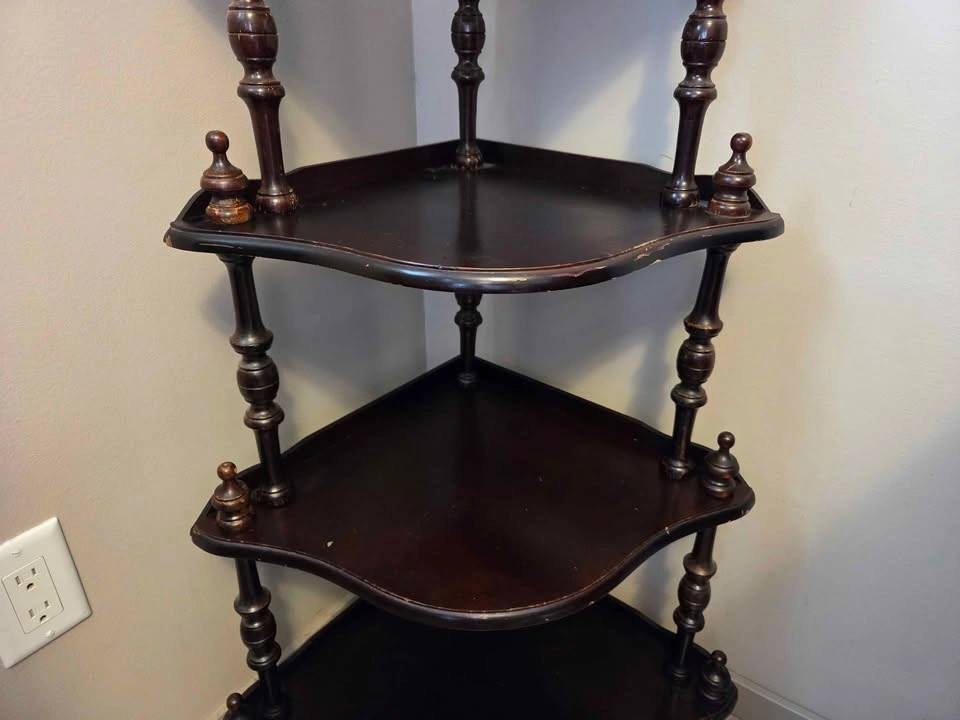 This cute little corner piece has been fixed up a bit. The pictures of the bottoms of the shelves show screws with wingnuts used to fasten things on better. One knob is loose and one shelf is cracked. It holds together well just standing in the corner with nick nacks and plants placed on it! It's not flimsy, and I liked it with some "ruggedness," but this would be a fun piece to refinish too, if that's your thing! Smoke free, bug free, cat friendly.