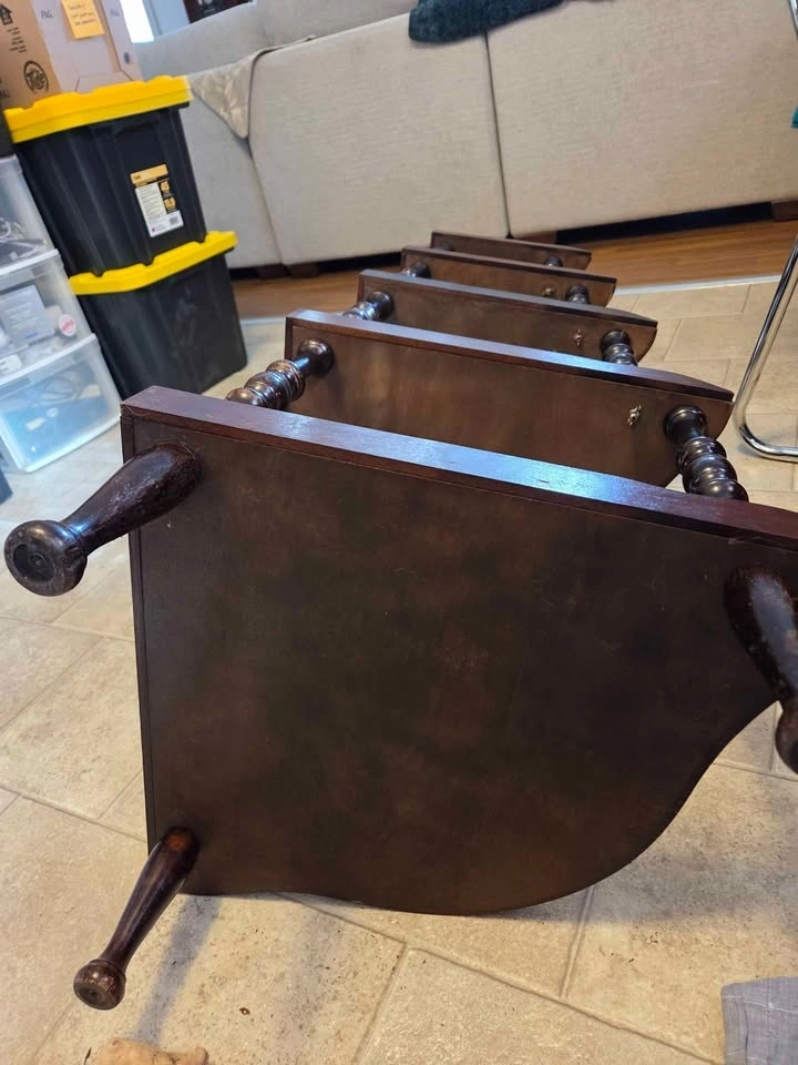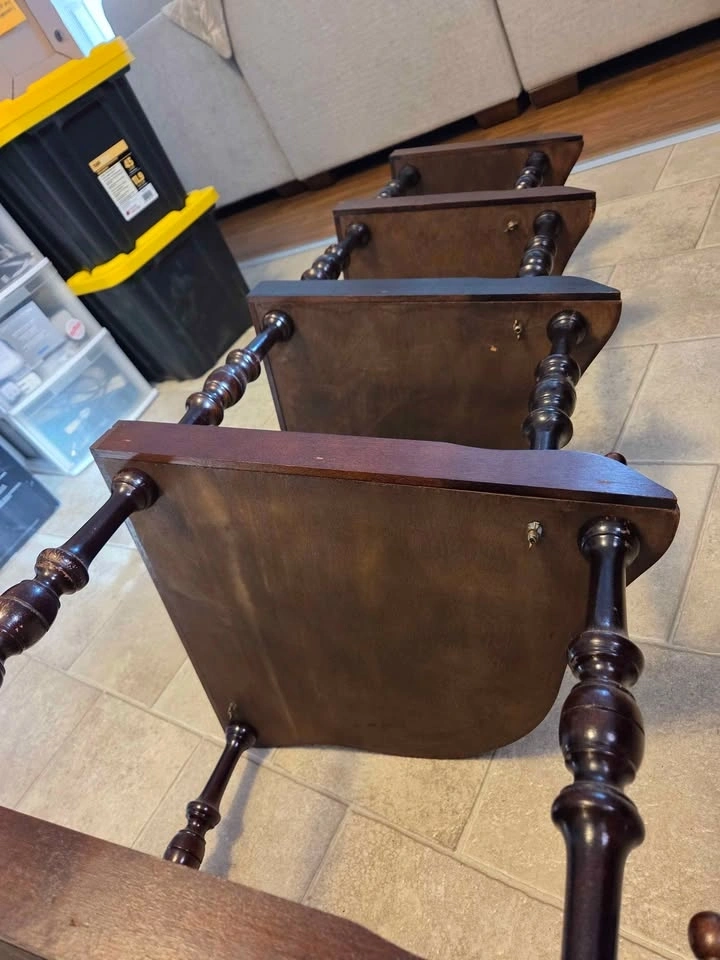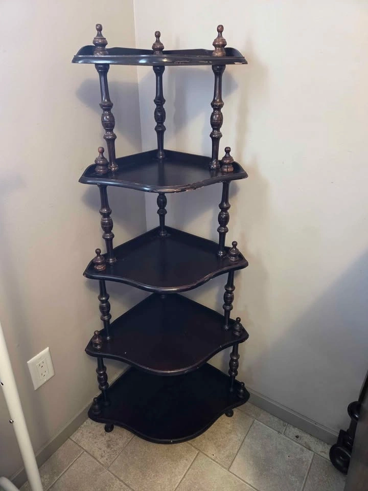 This cute little corner piece has been fixed up a bit. The pictures of the bottoms of the shelves show screws with wingnuts used to fasten things on better. One knob is loose and one shelf is cracked. It holds together well just standing in the corner with nick nacks and plants placed on it! It's not flimsy, and I liked it with some "ruggedness," but this would be a fun piece to refinish too, if that's your thing! Smoke free, bug free, cat friendly.