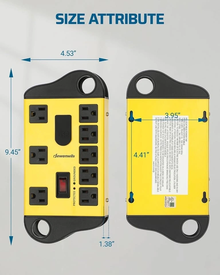 DEWENWILS Garage Power Strip Wall Mount, Wide Space 8-Outlet Industrial Power Strip with 2 USB ports. Features a metal surge protector (1440J) and a heavy-duty 14AWG, 6ft extension cord. Great for garages and workshops. Yellow color.