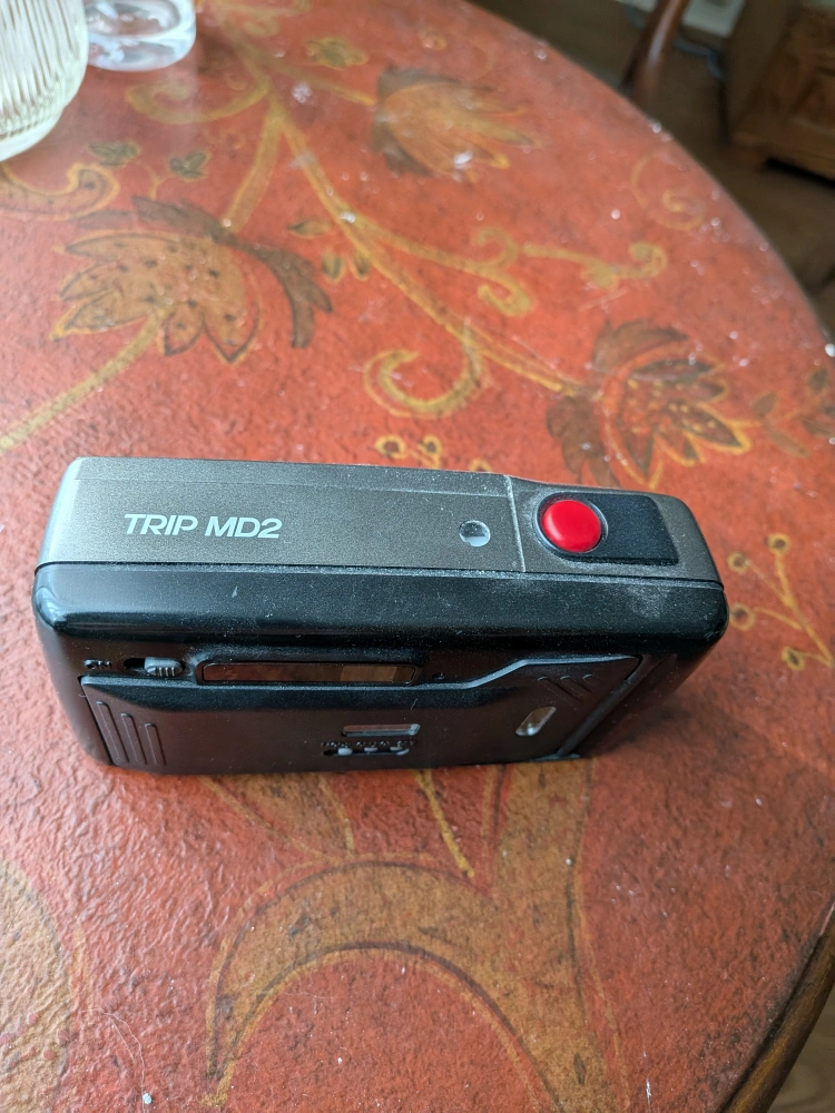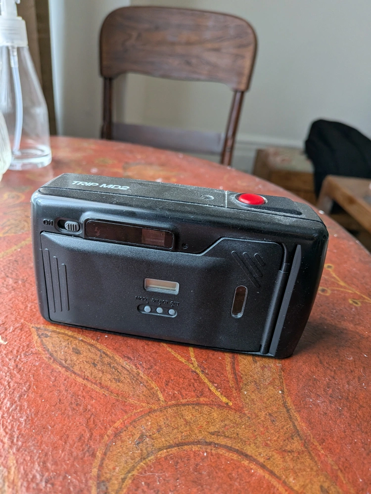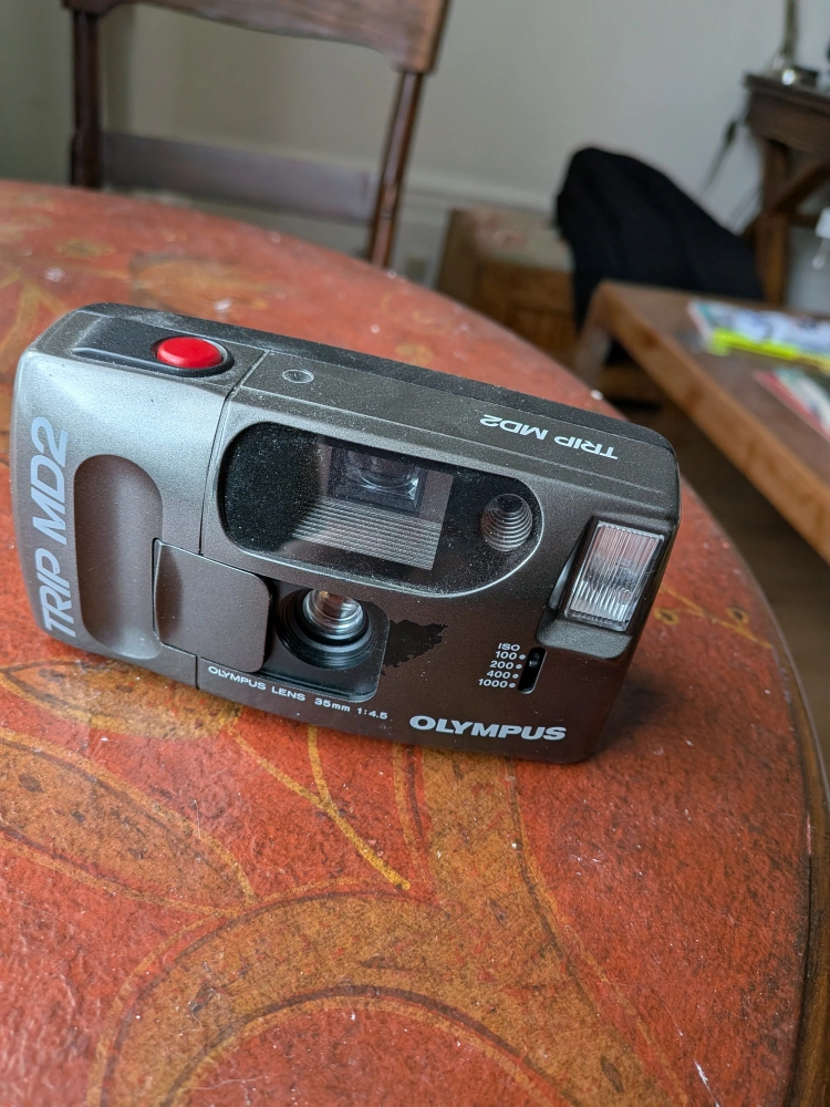 Olympus Trip MD2 point-and-shoot 35mm film camera. Features a 35mm 1:4.5 lens and flash with ISO settings for 100, 200, 400, and 1000. Made in Taiwan.