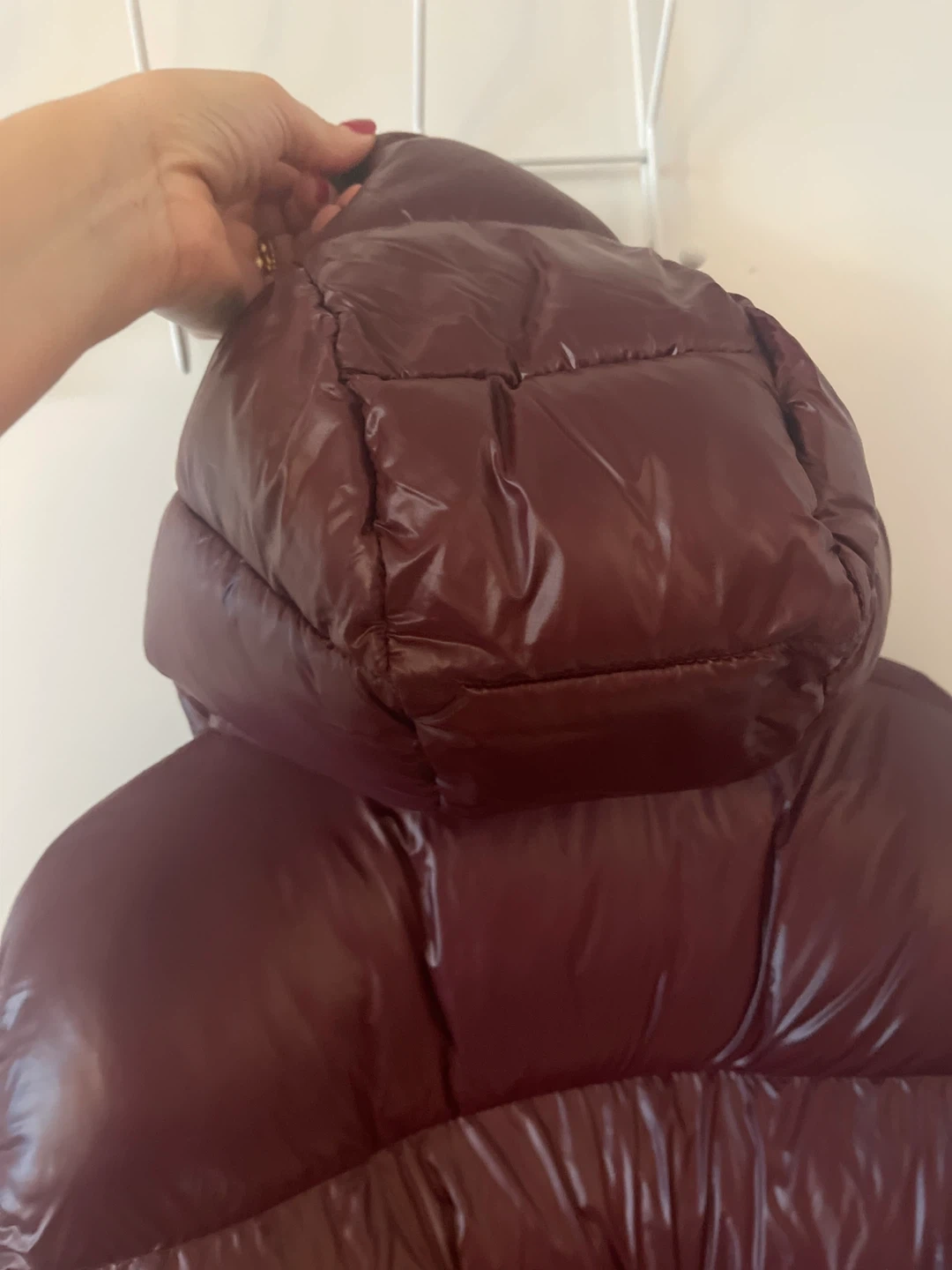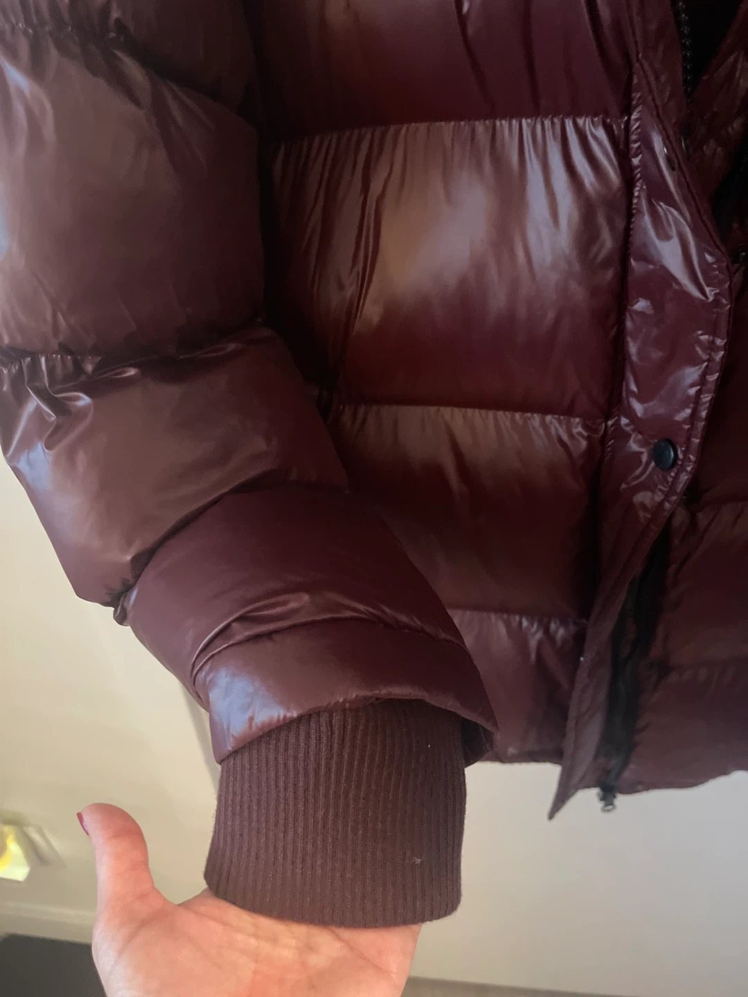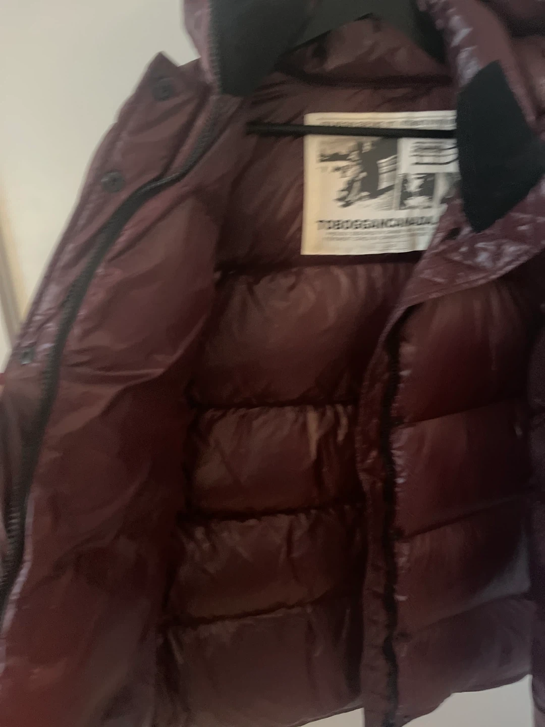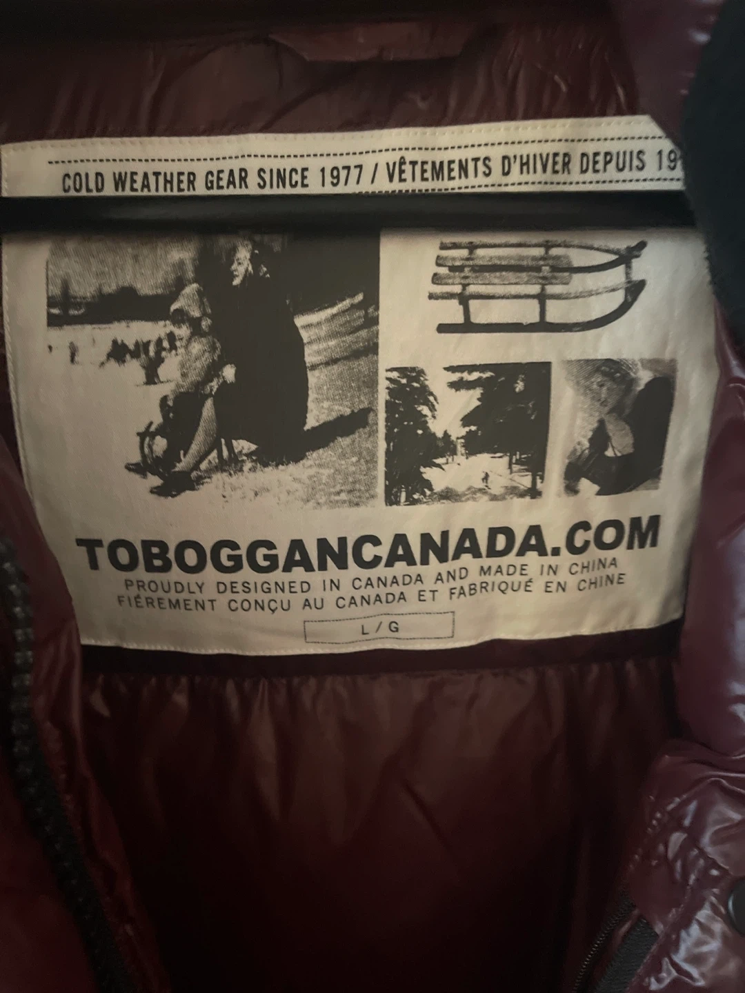 This Toboggan Canada jacket is designed for cold weather. It features a shiny burgundy shell and a filled interior. Size is L/G.