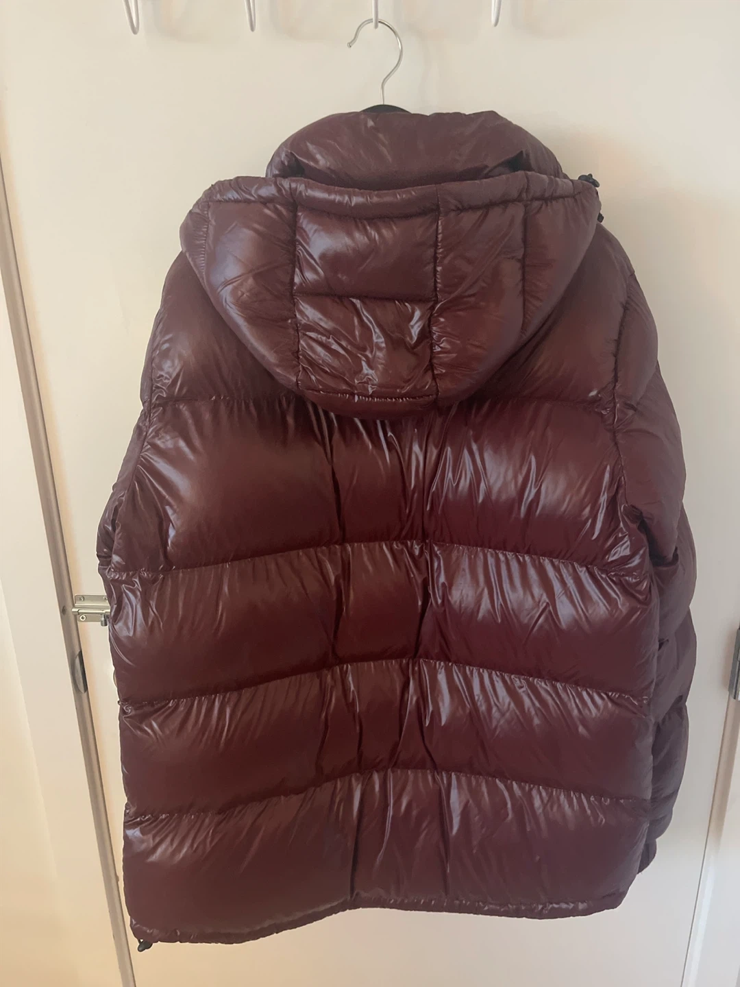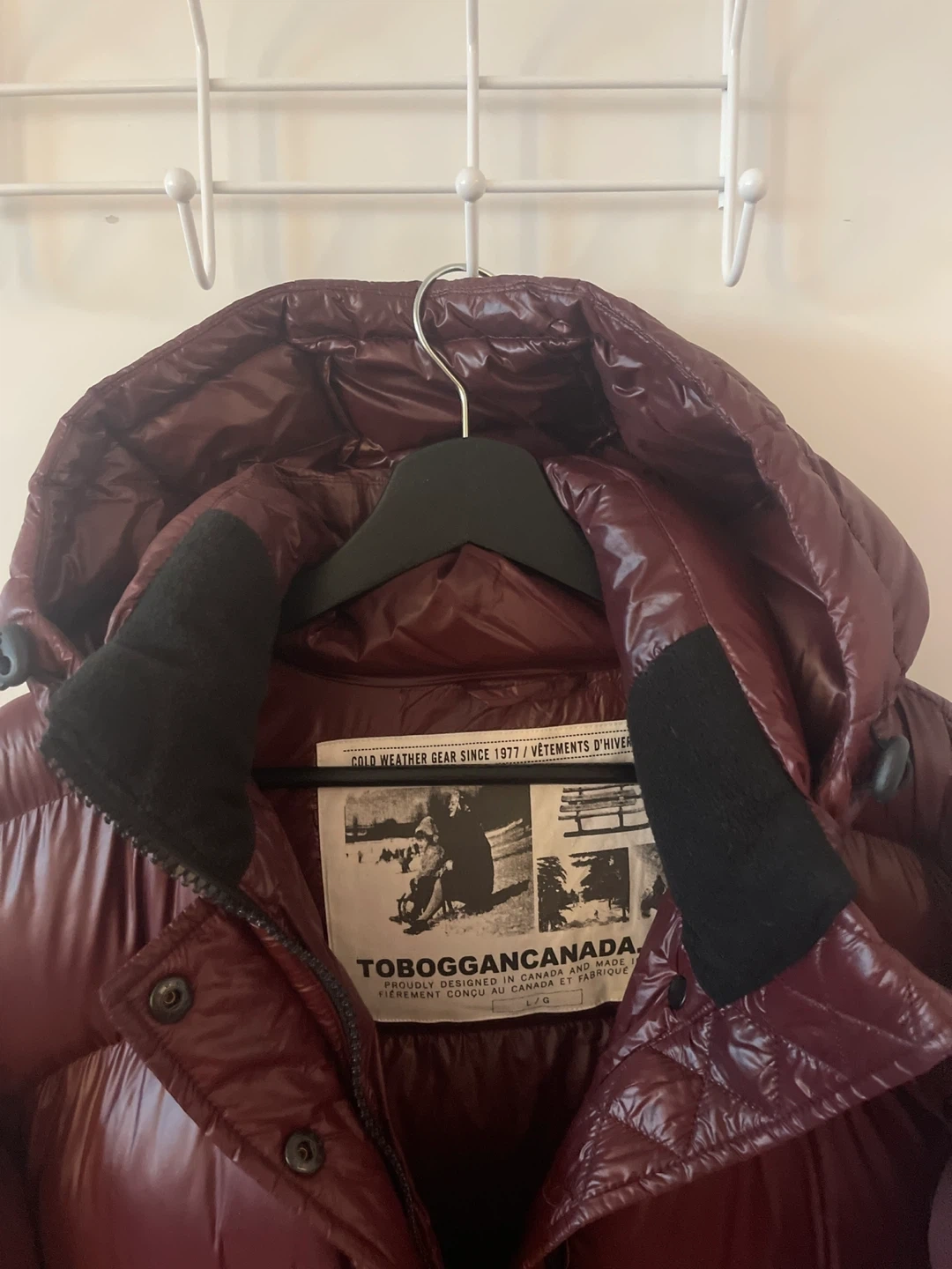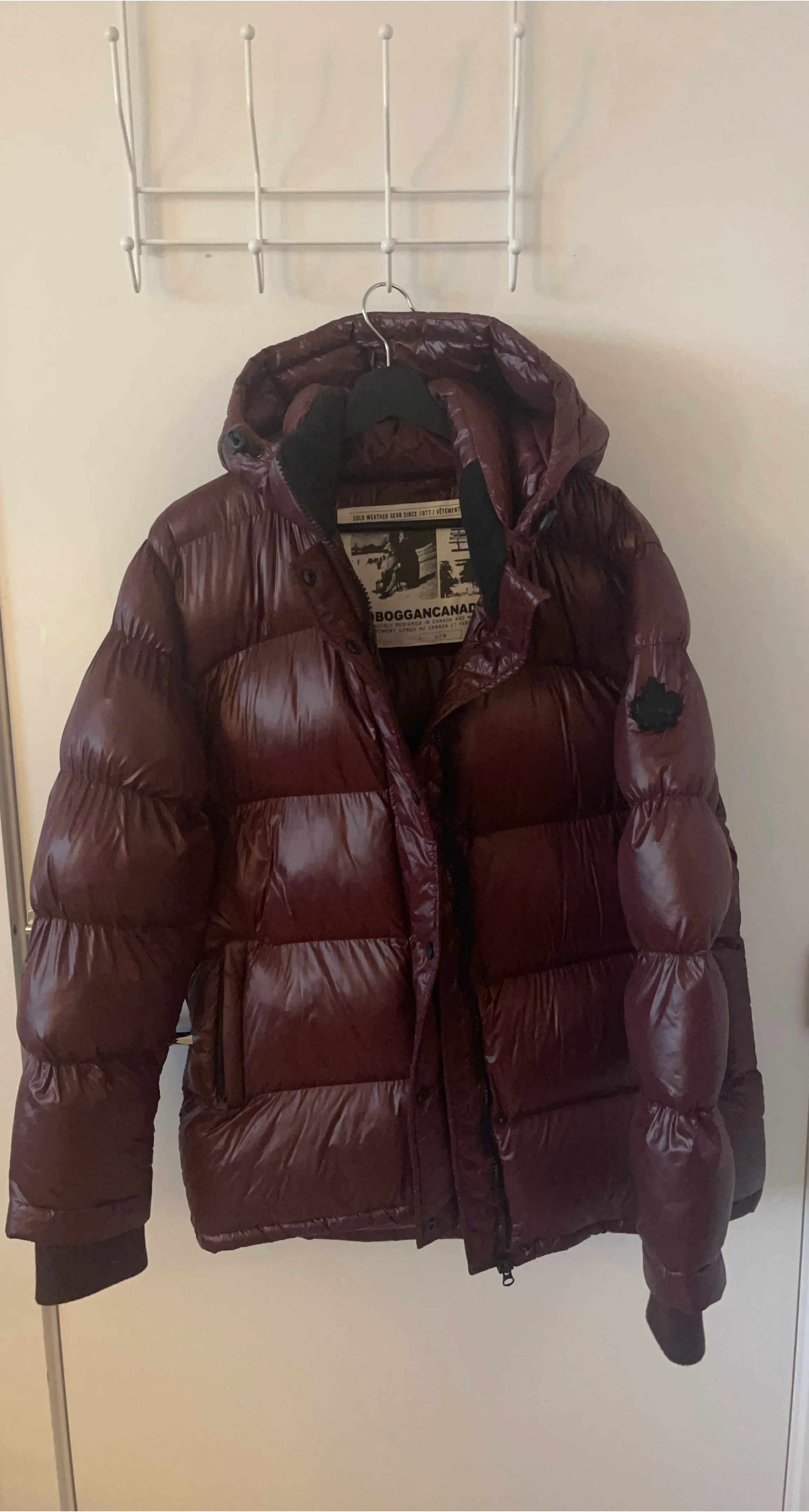 This Toboggan Canada jacket is designed for cold weather. It features a shiny burgundy shell and a filled interior. Size is L/G.