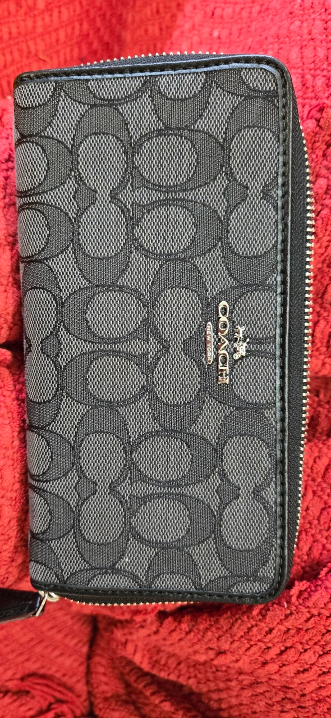 This is a Coach zip-around wallet with the classic C pattern. It's black and grey, and has multiple card slots and a zip pocket inside. It's great for organizing your essentials.